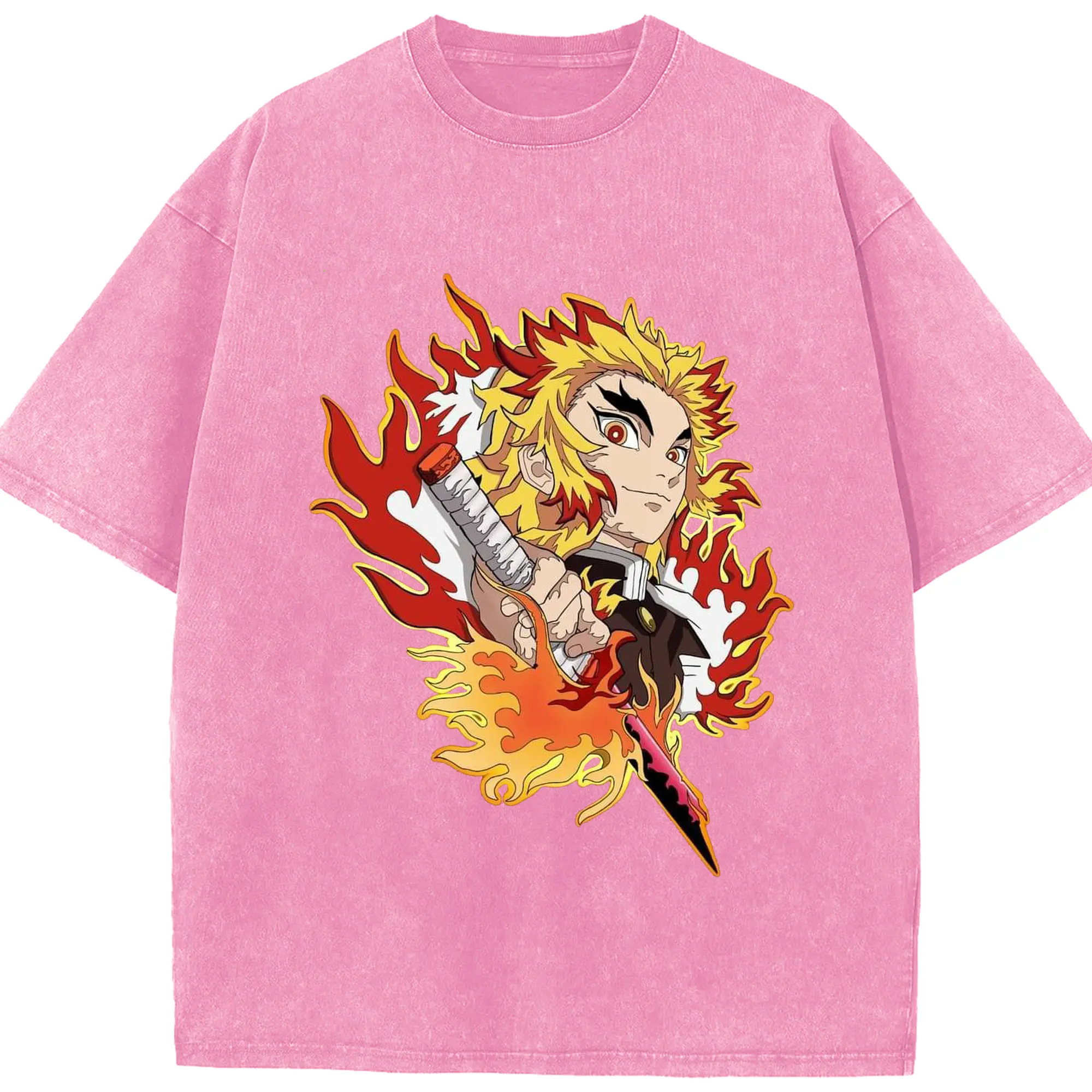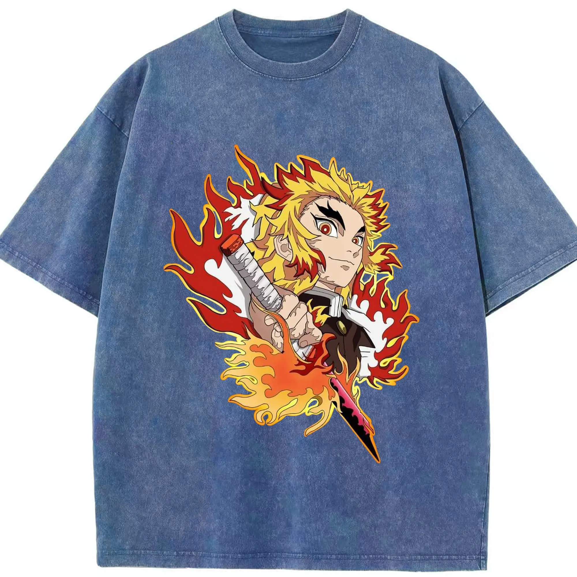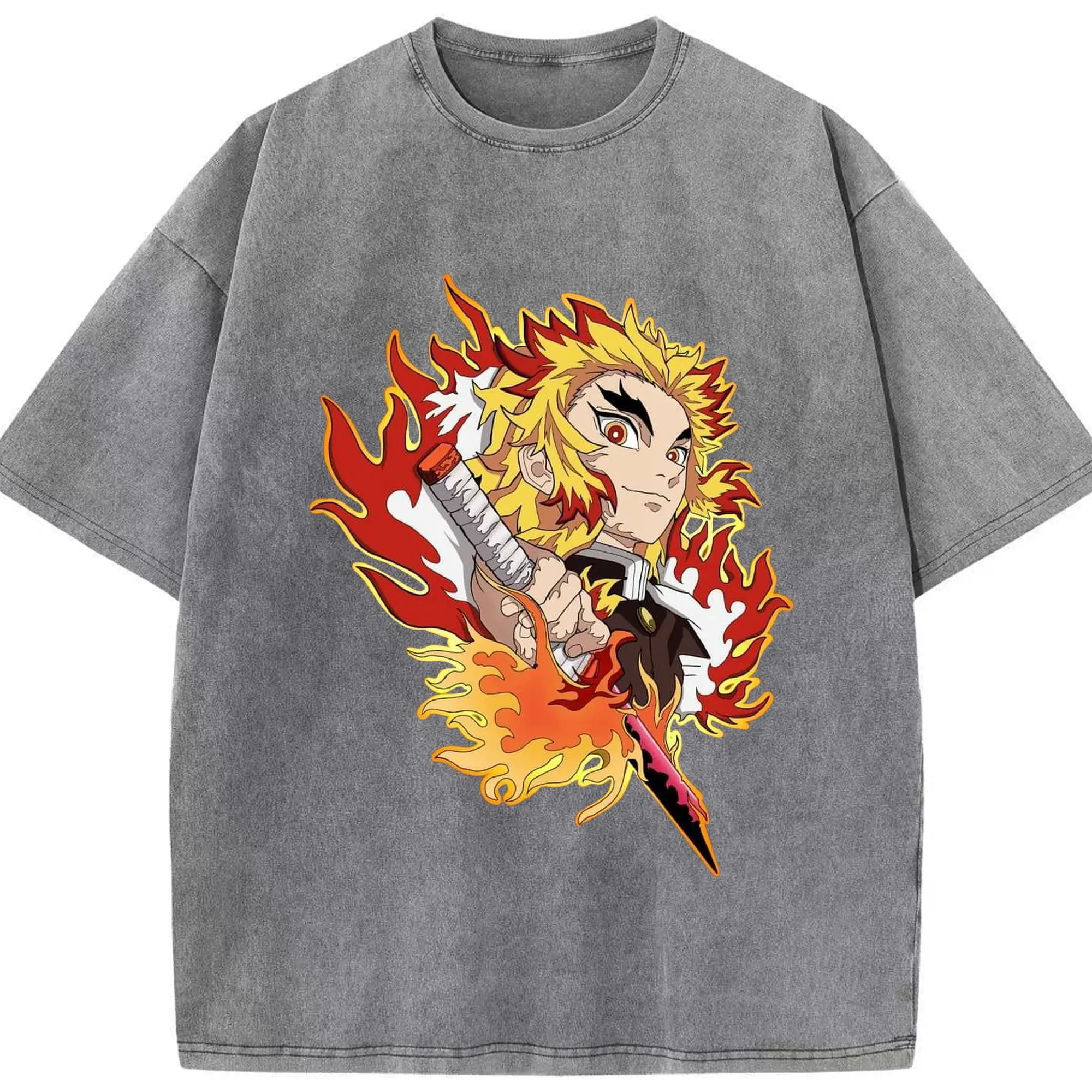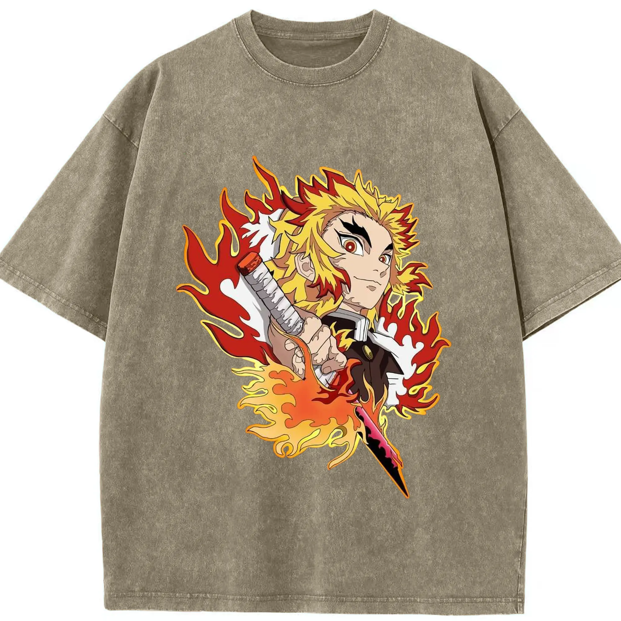 鬼滅の刃 無限列車編 煉獄杏寿郎 - 綿100% ヴィンテージ風 半袖Tシャツ ・ フロントプリント ・ 柔らか肌触り ・ 通気性 快適 ・ スポーツ カジュアル 外出用
