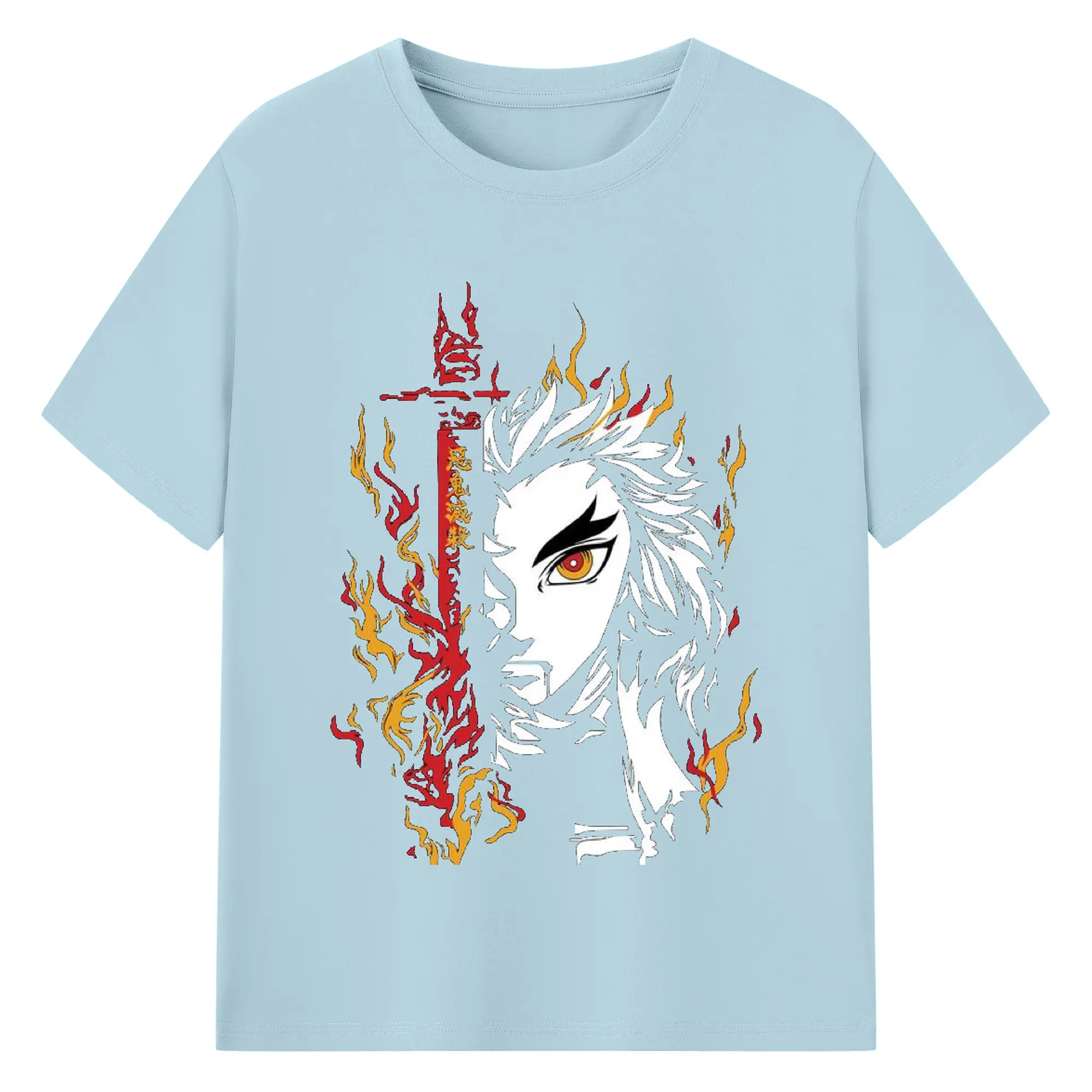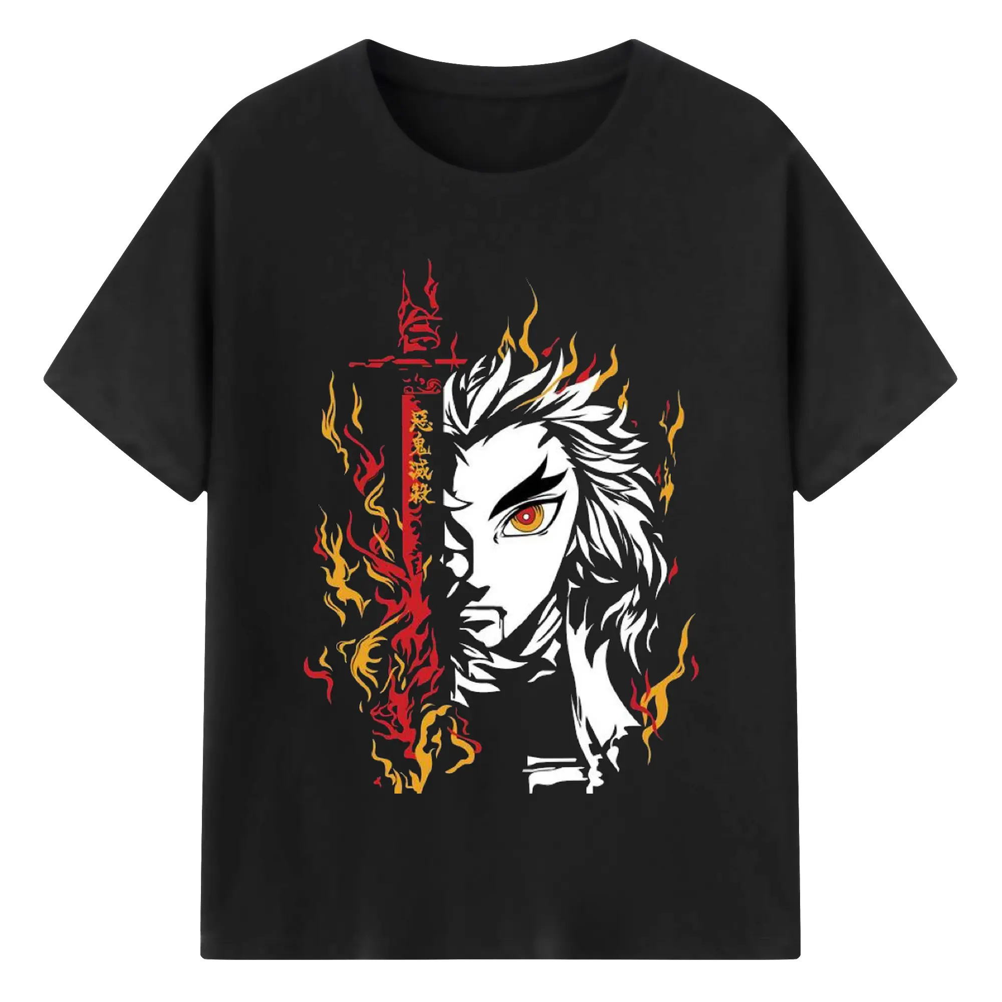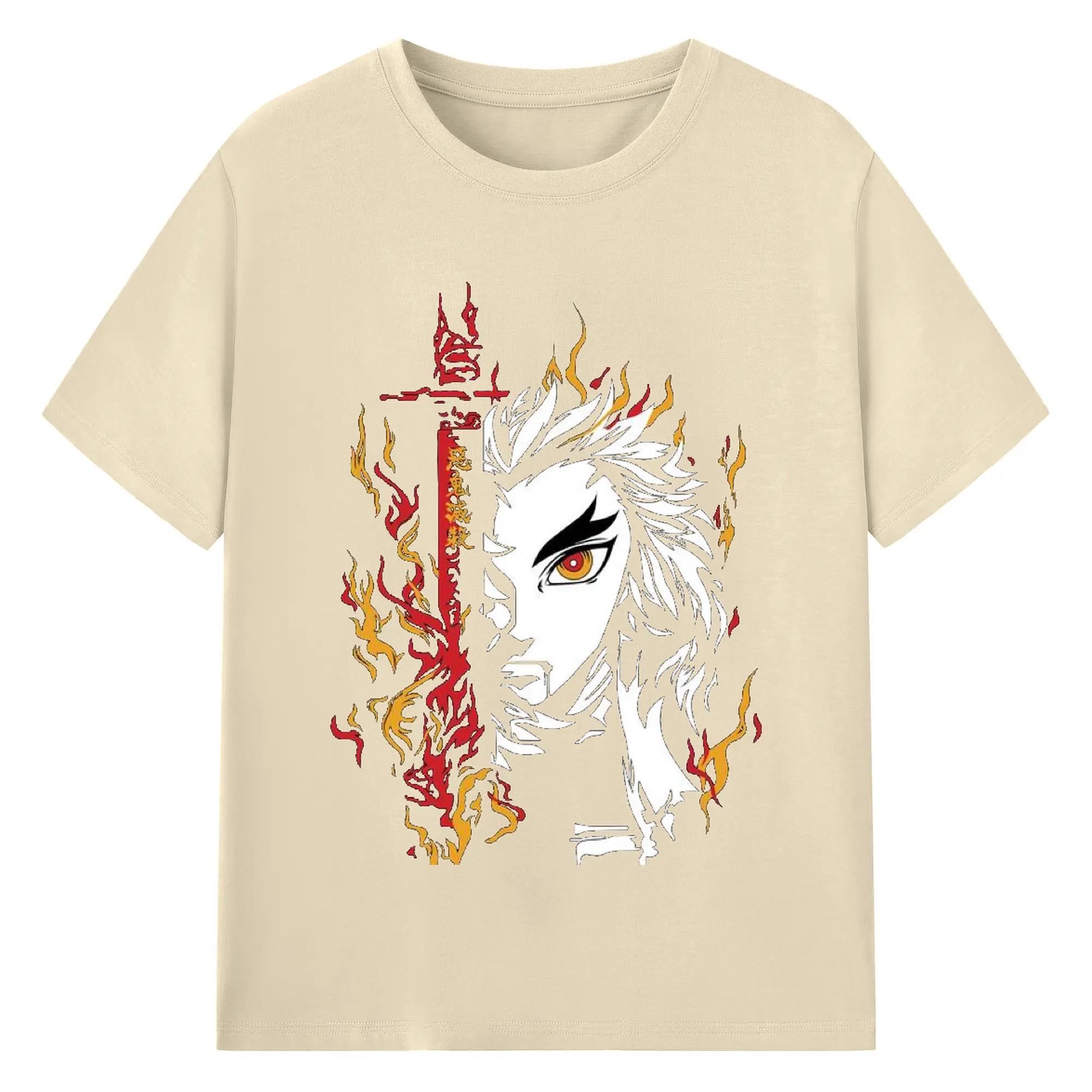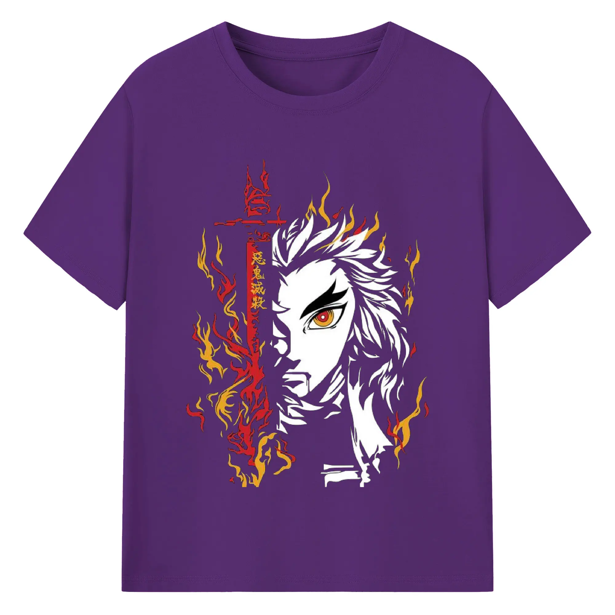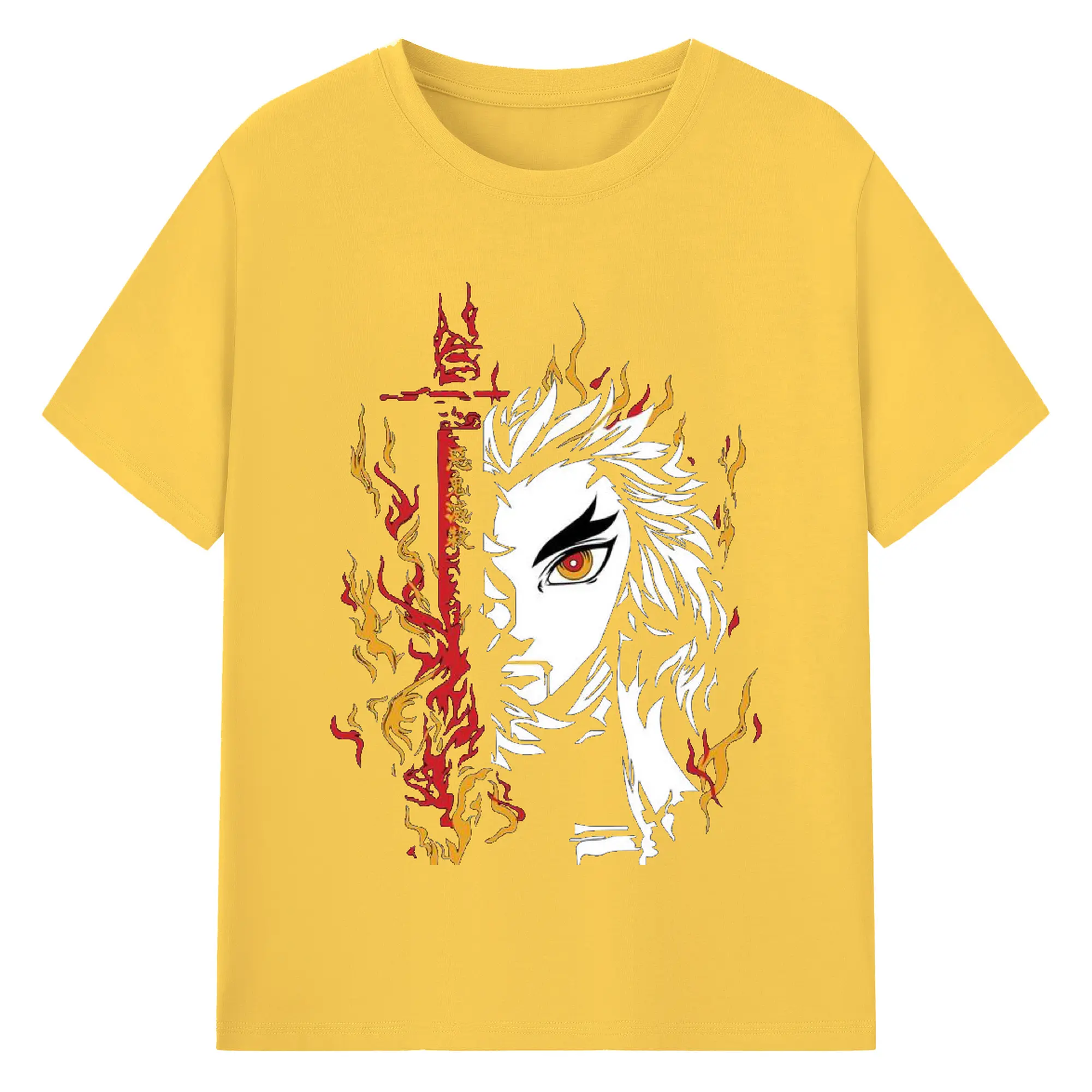 鬼滅の刃 無限列車編 煉獄杏寿郎 - 綿100% 半袖Tシャツ ・ フロントプリント ・ 快適 通気性 ・ 日常使い 散歩 スポーツ用