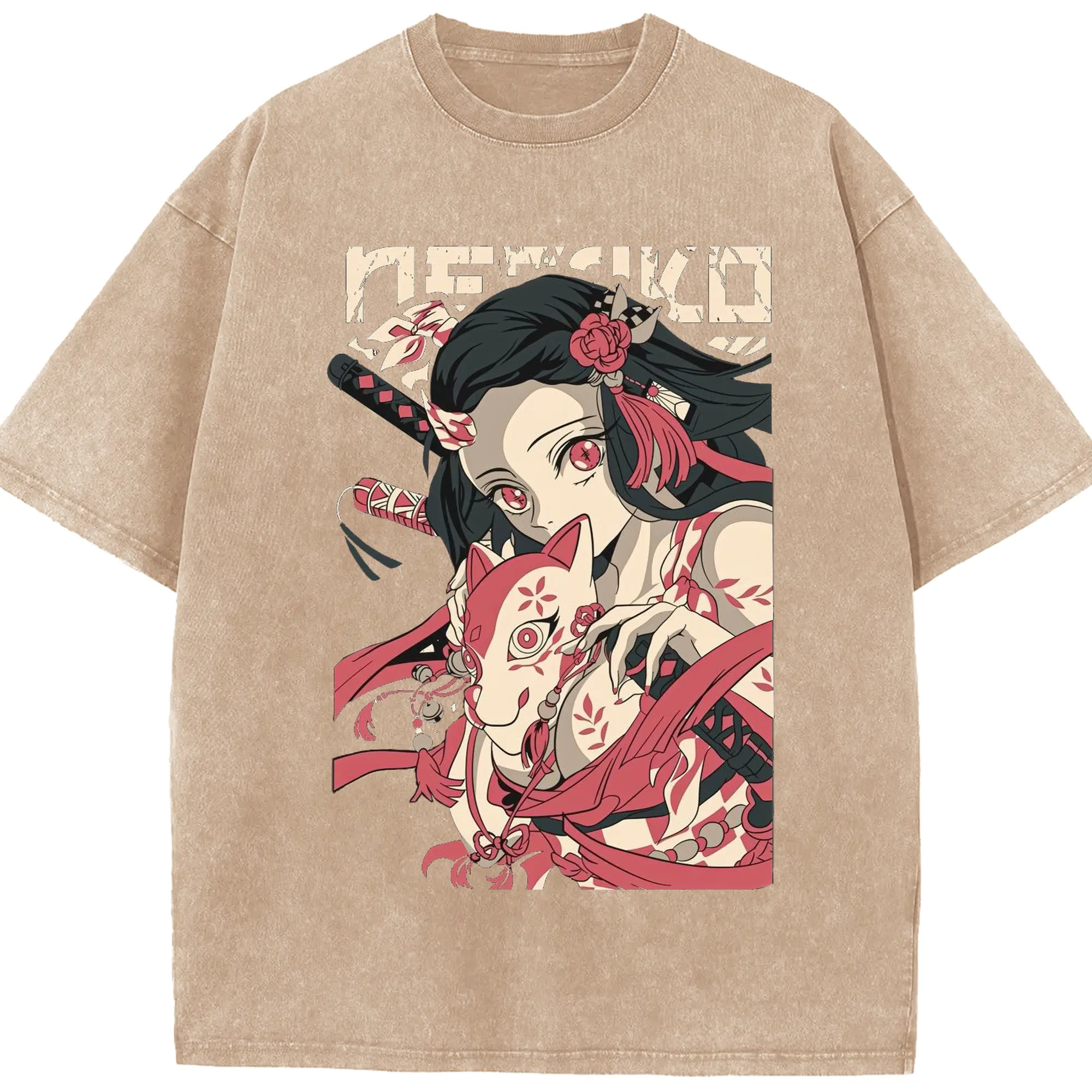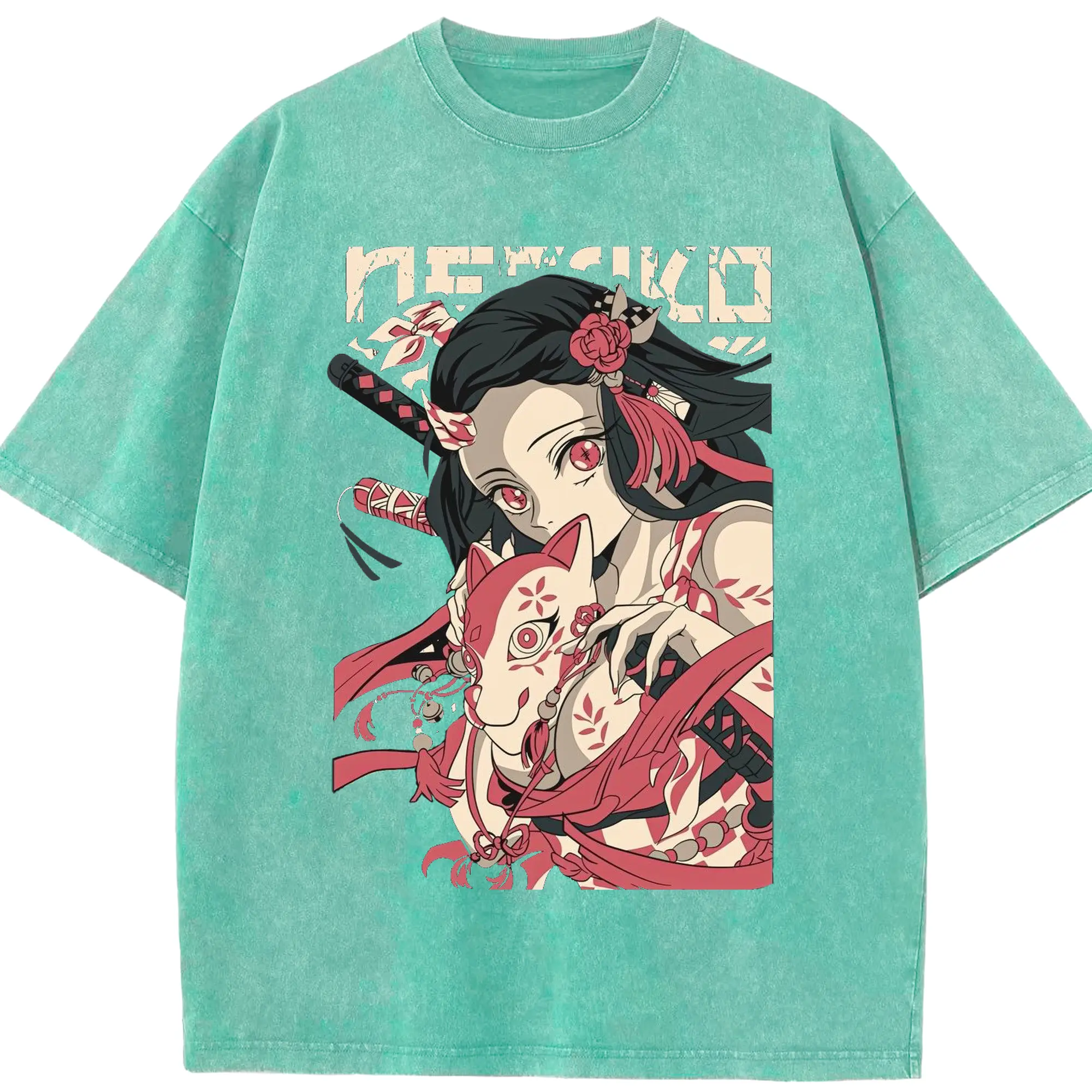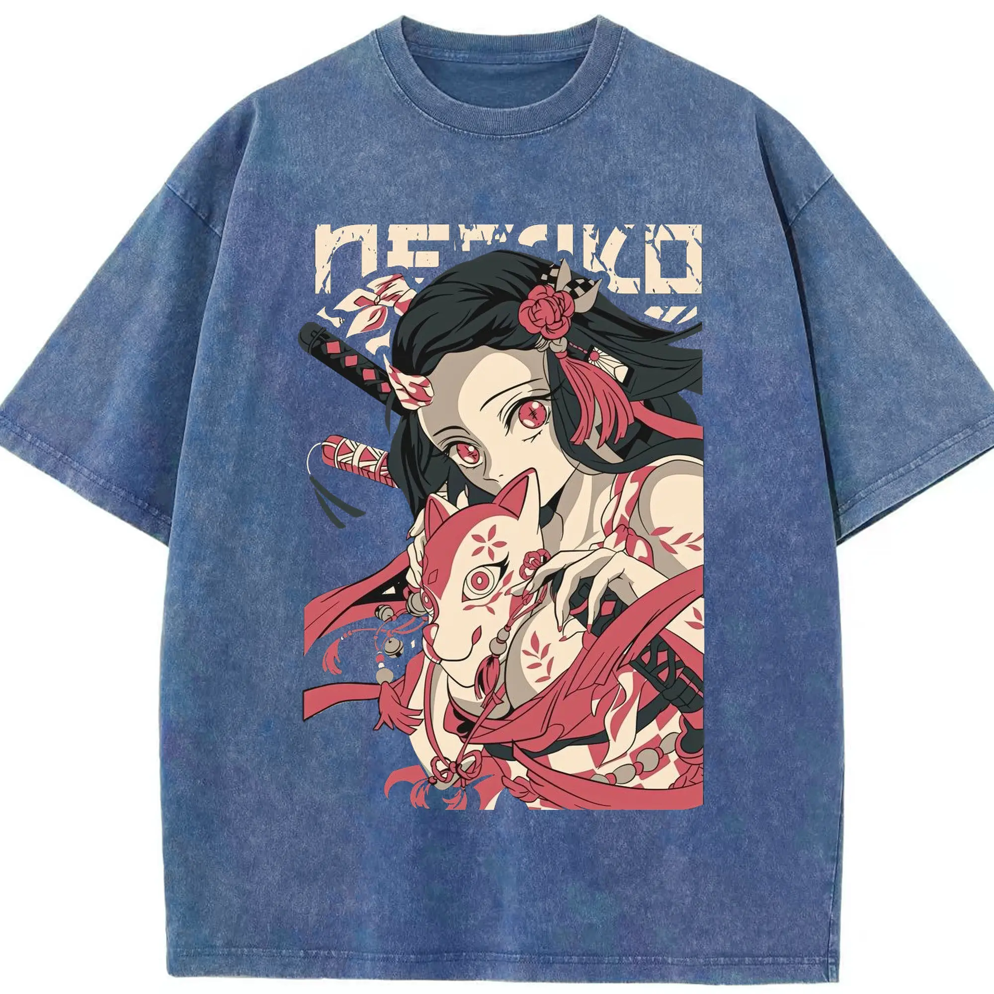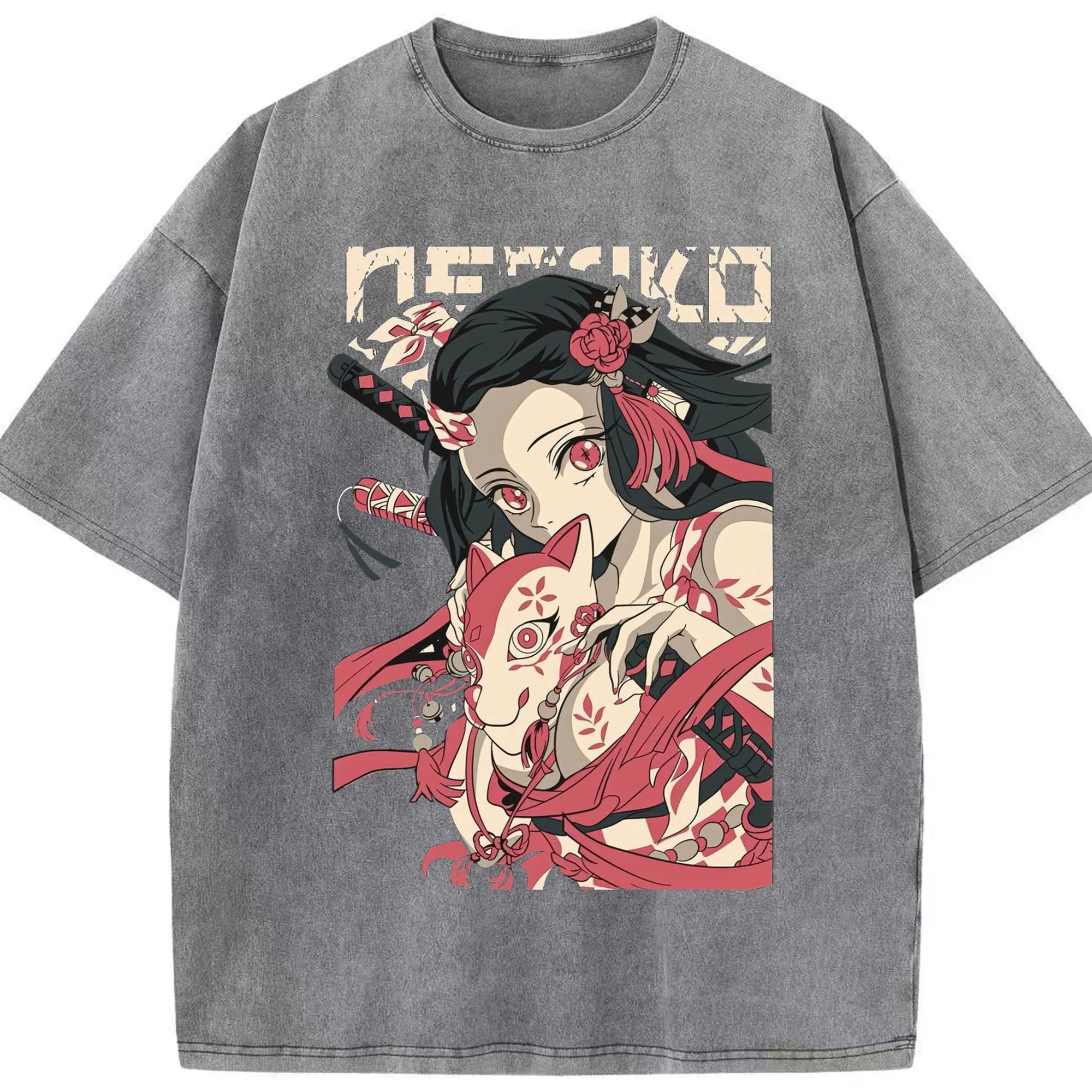 鬼滅の刃 竈門禰豆子 禰豆子鬼化 - 綿100% ヴィンテージ風 半袖Tシャツ ・ フロントプリント ・ 柔らか肌触り ・ 通気性 快適 ・ スポーツ カジュアル 外出用