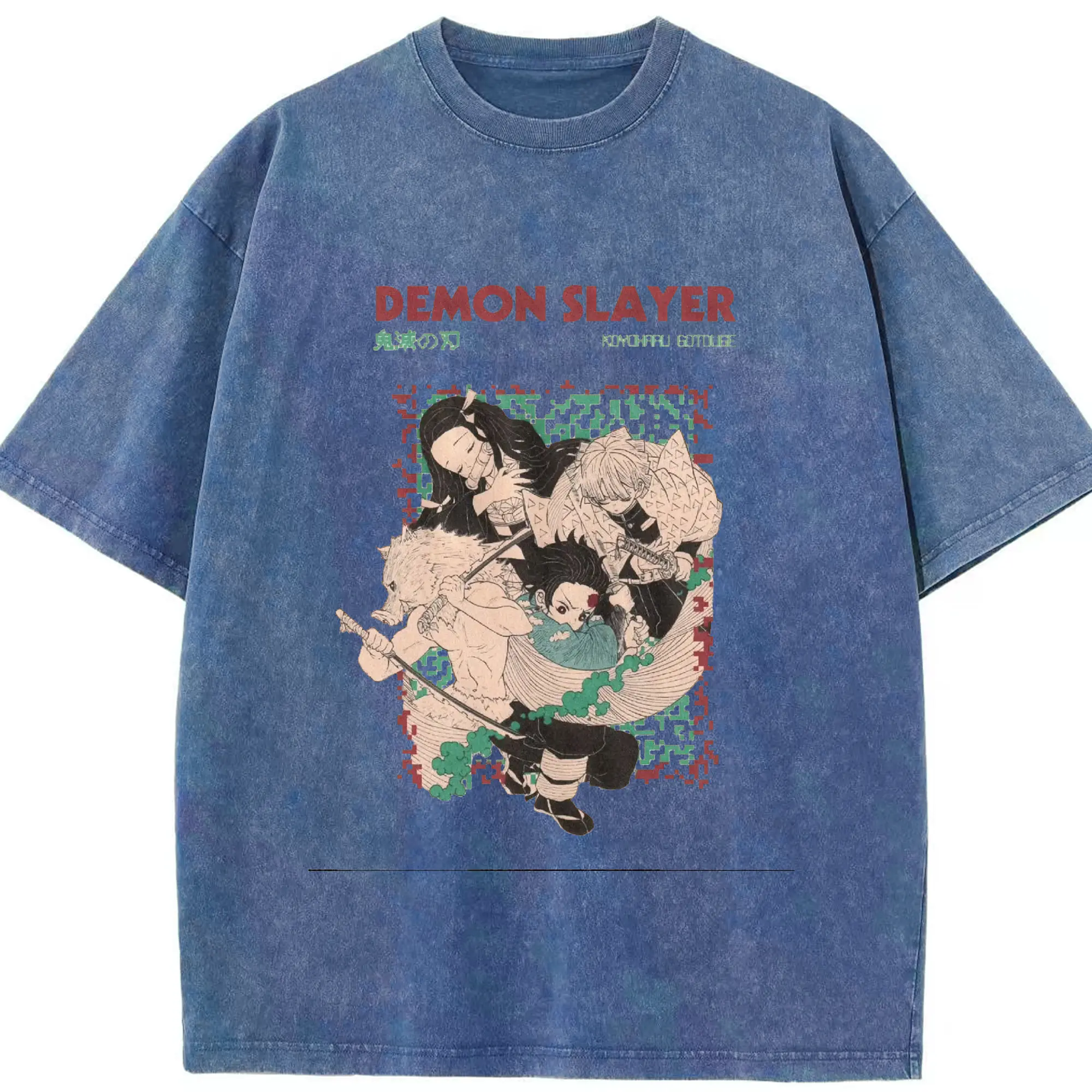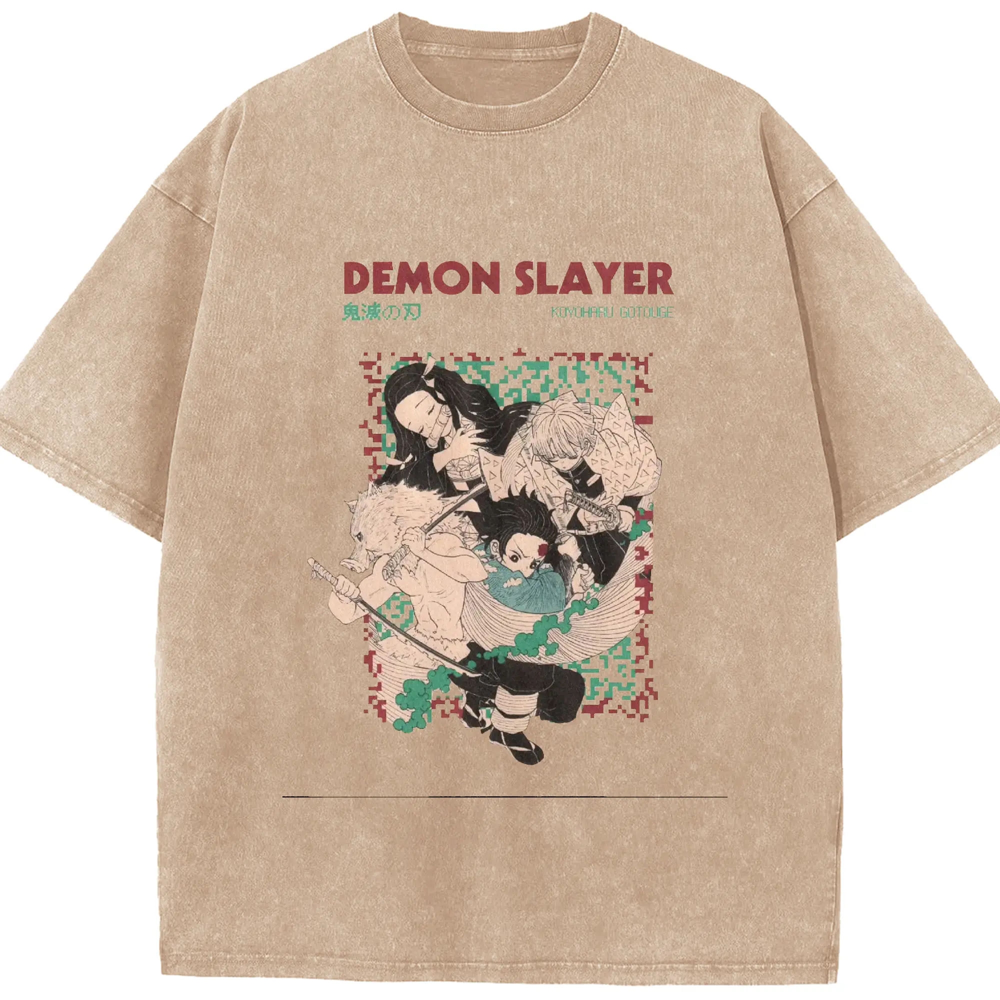 鬼滅の刃 鬼殺隊 炭治郎禰豆子善逸伊之助 - 綿100% ヴィンテージ風 半袖Tシャツ ・ フロントプリント ・ 柔らか肌触り ・ 通気性 快適 ・ スポーツ カジュアル 外出用