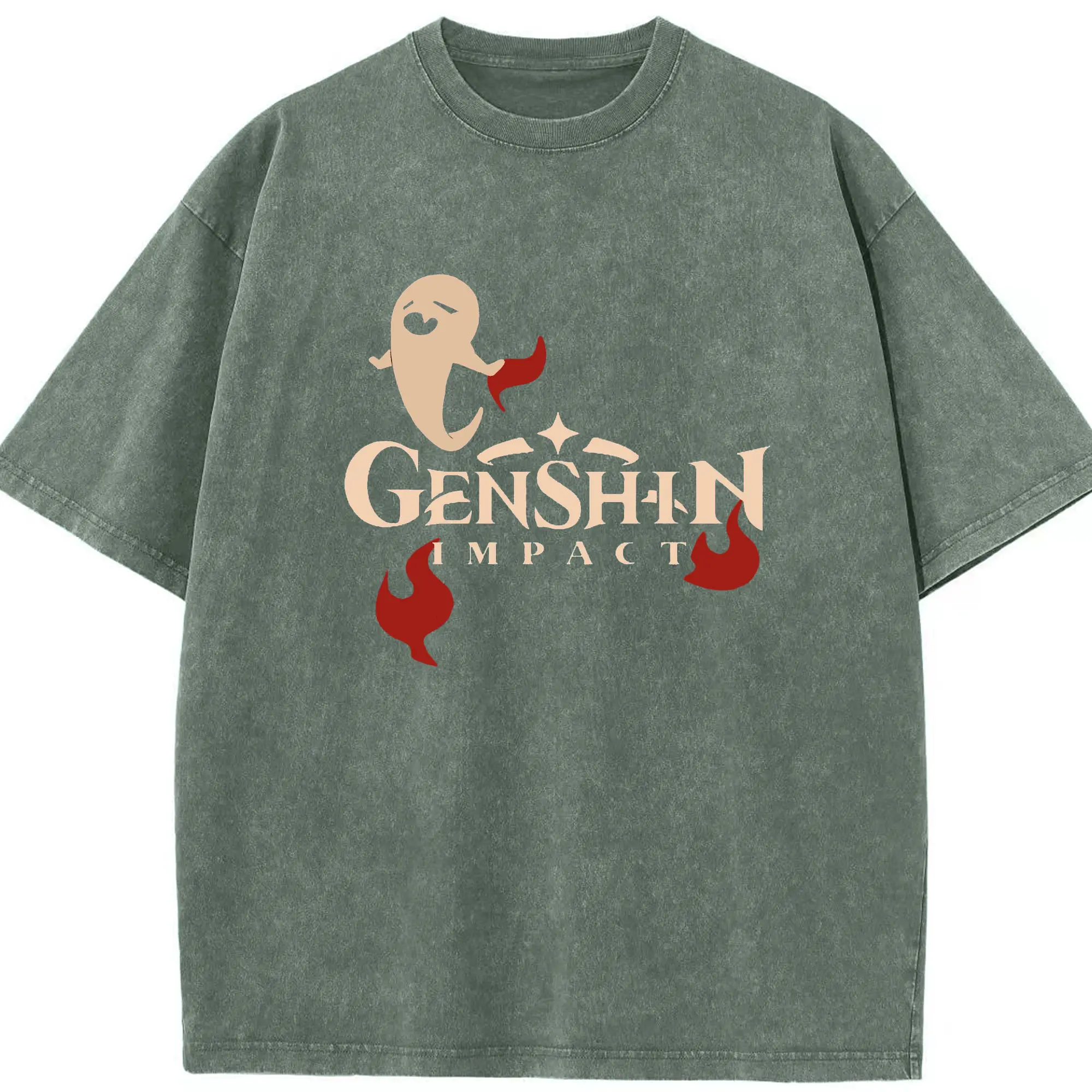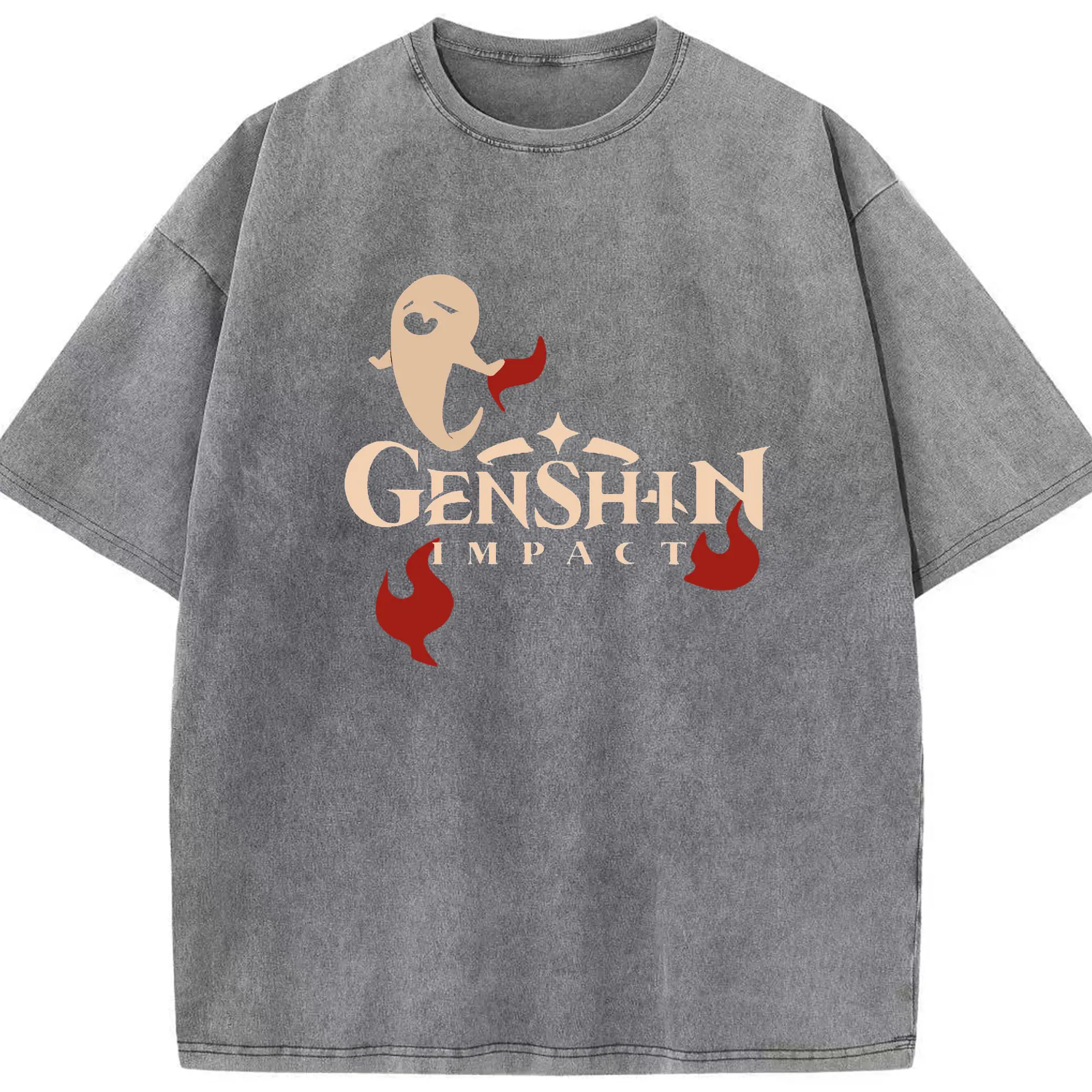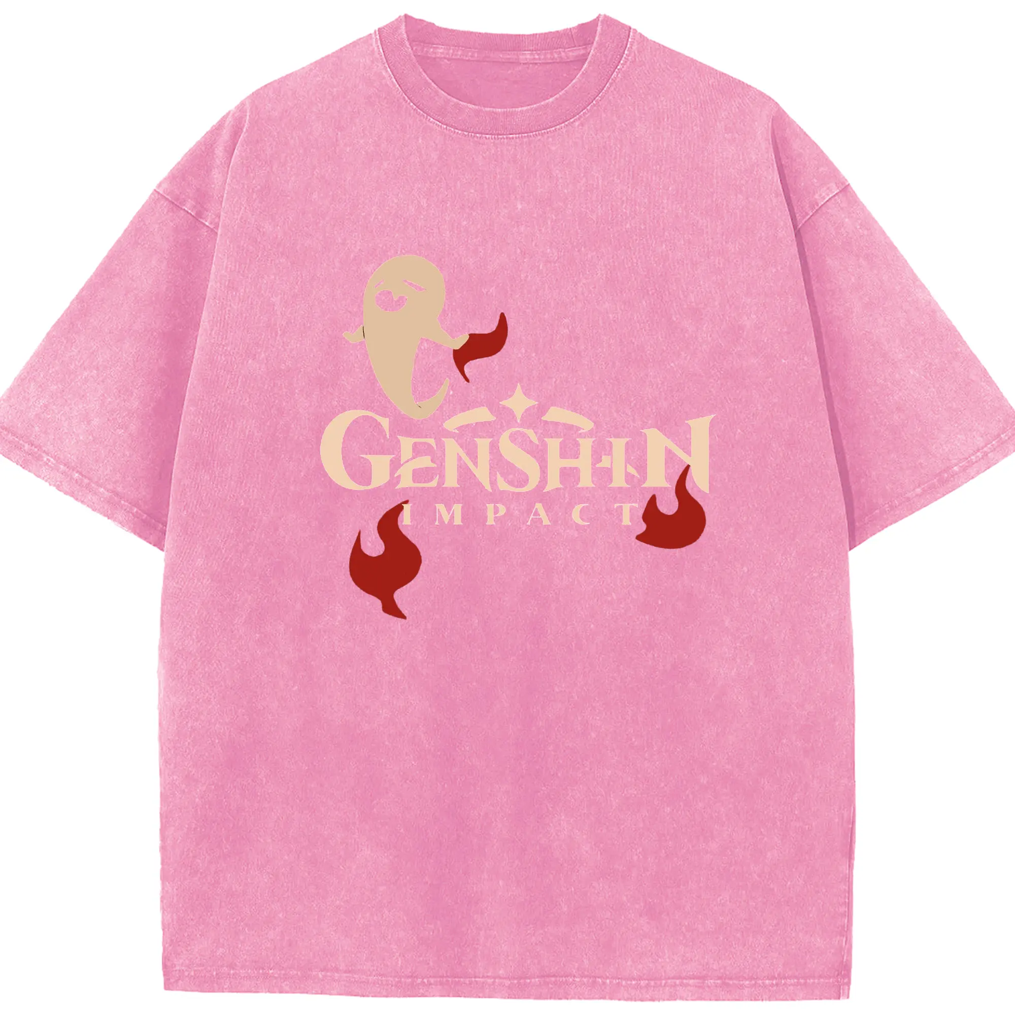 Genshi フータオ シンプル原神ロゴ - 綿100% ヴィンテージ風 半袖Tシャツ ・ フロントプリント ・ 柔らか肌触り ・ 通気性 快適 ・ スポーツ カジュアル 外出用