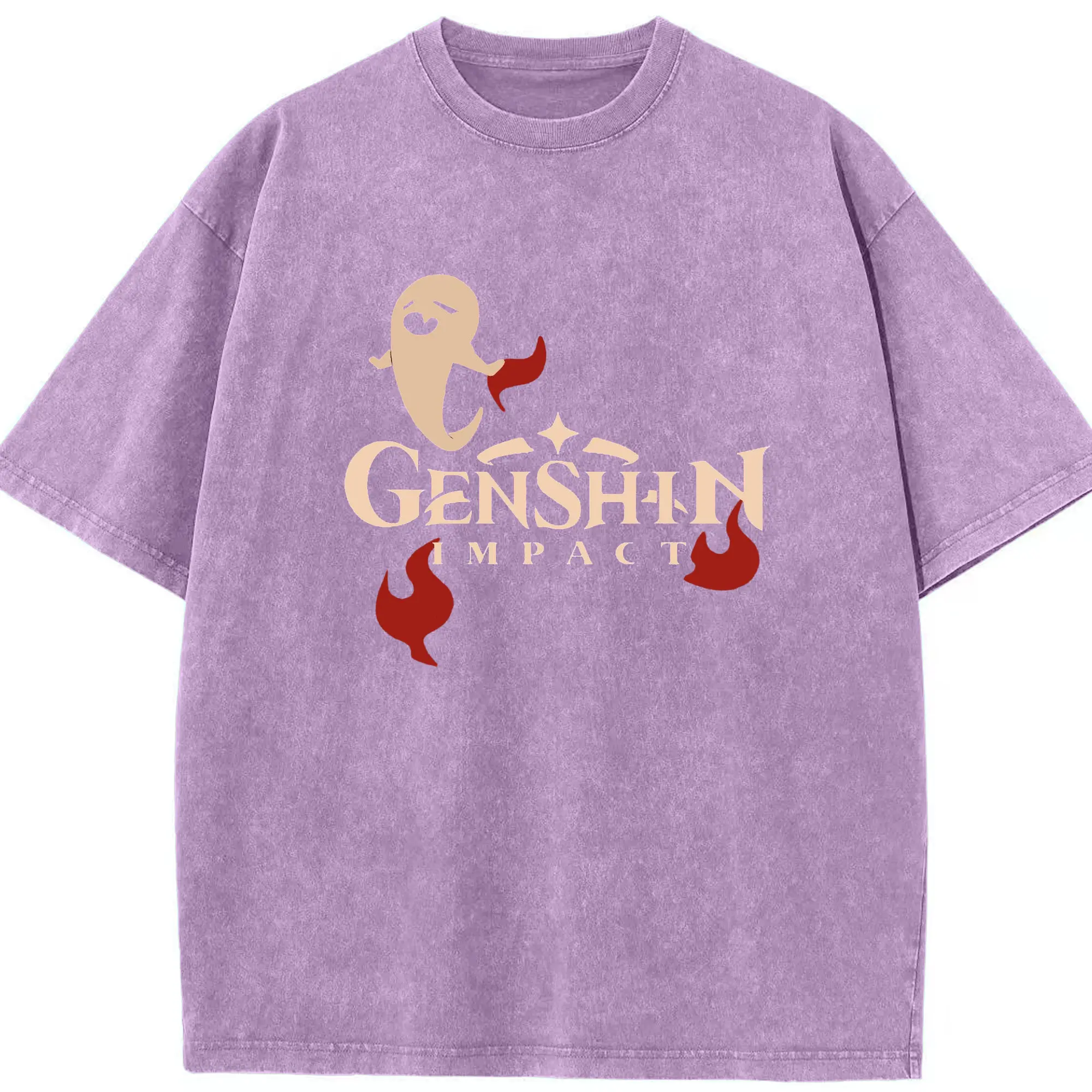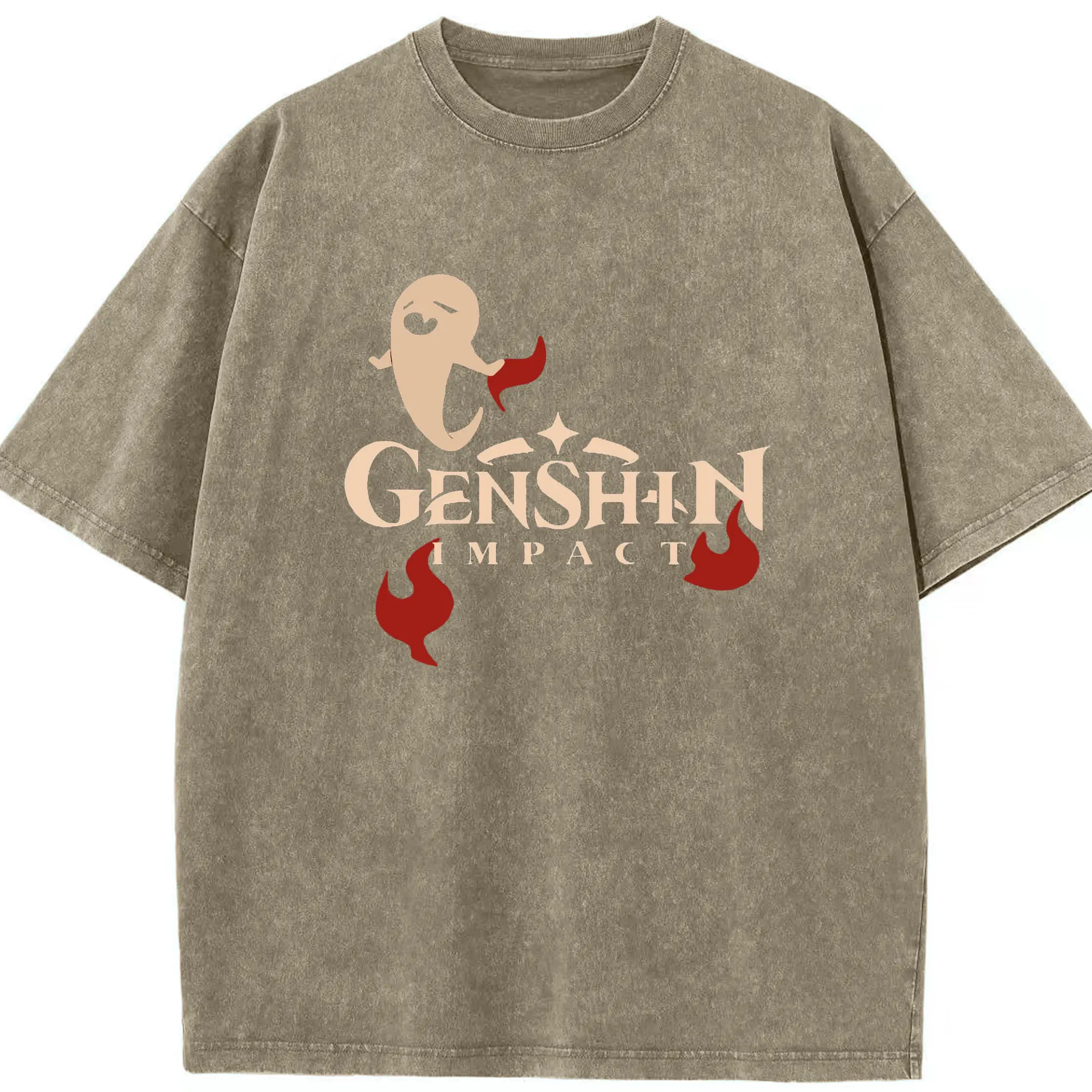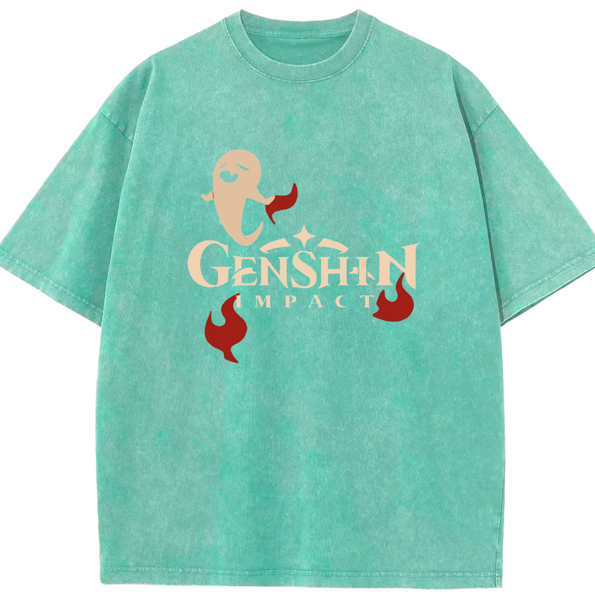 Genshi フータオ シンプル原神ロゴ - 綿100% ヴィンテージ風 半袖Tシャツ ・ フロントプリント ・ 柔らか肌触り ・ 通気性 快適 ・ スポーツ カジュアル 外出用
