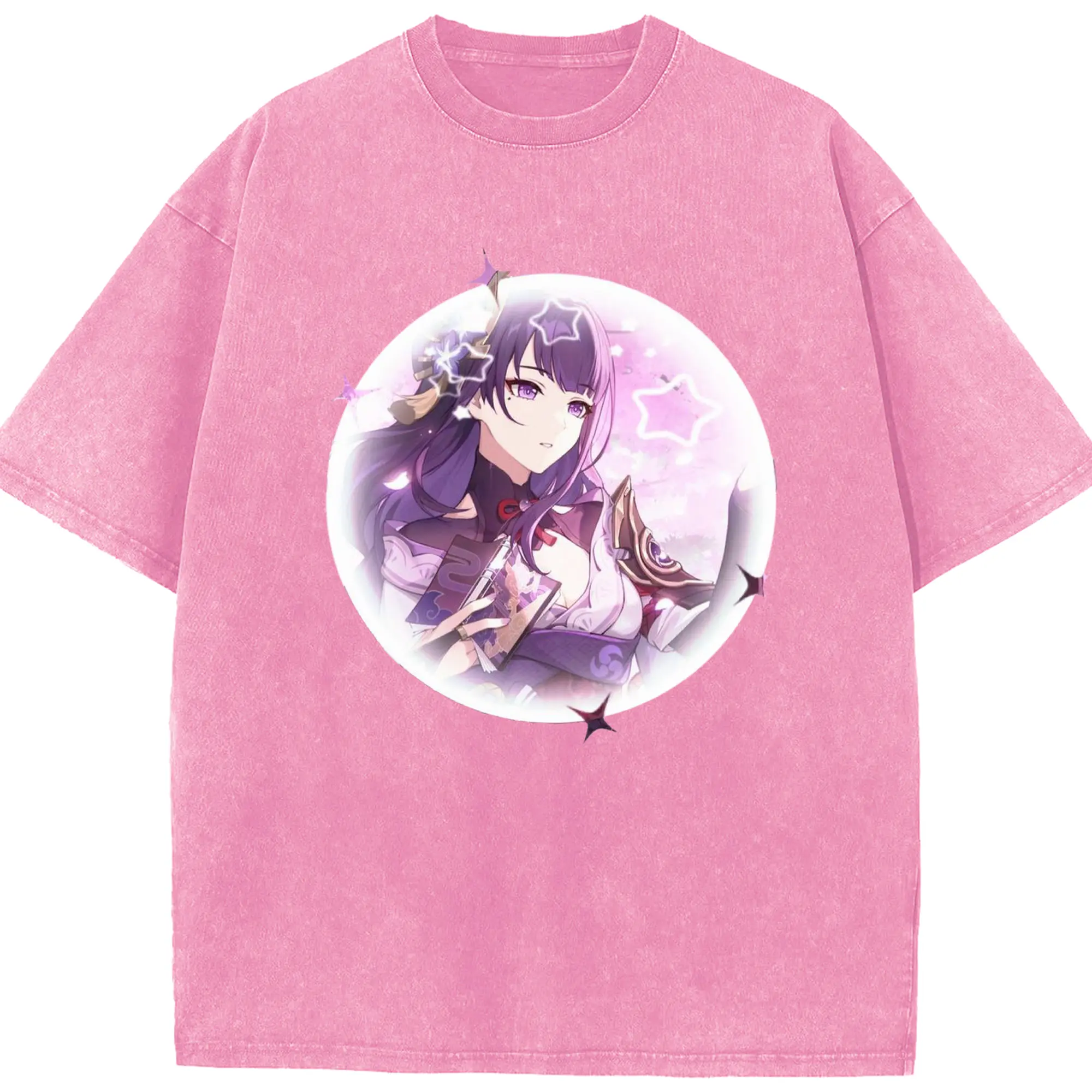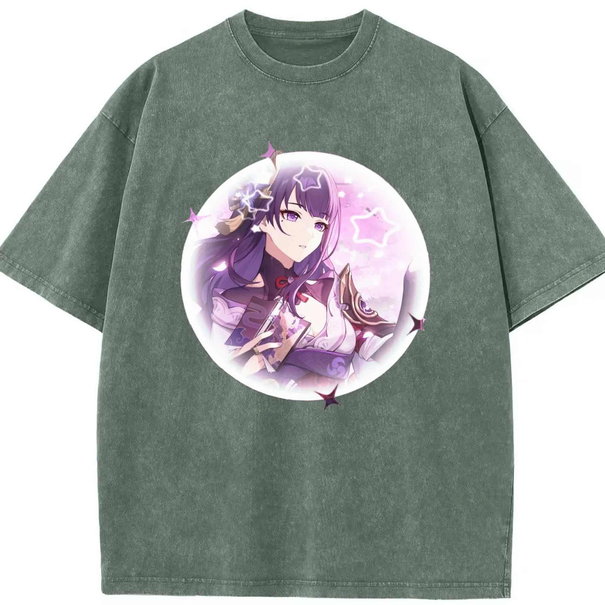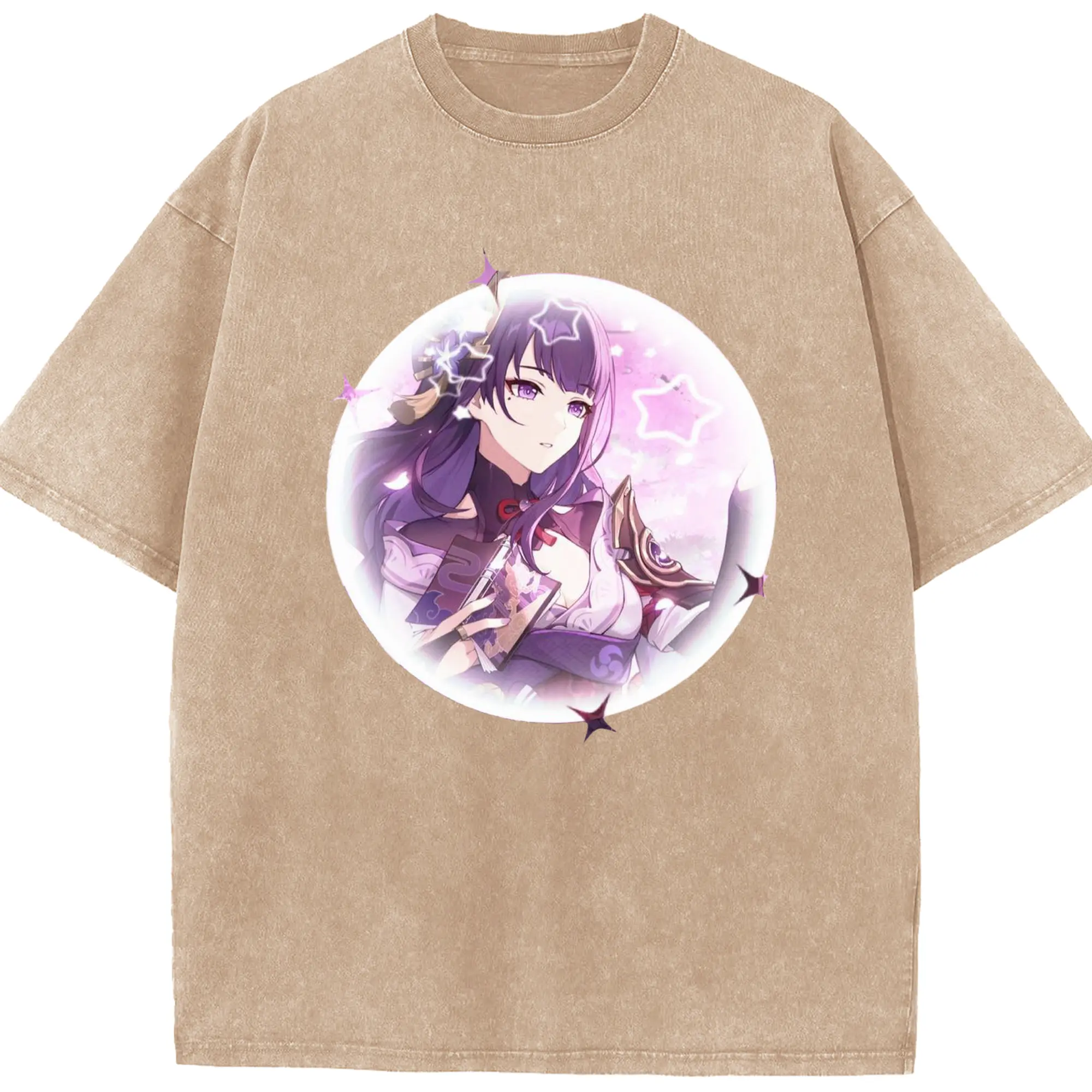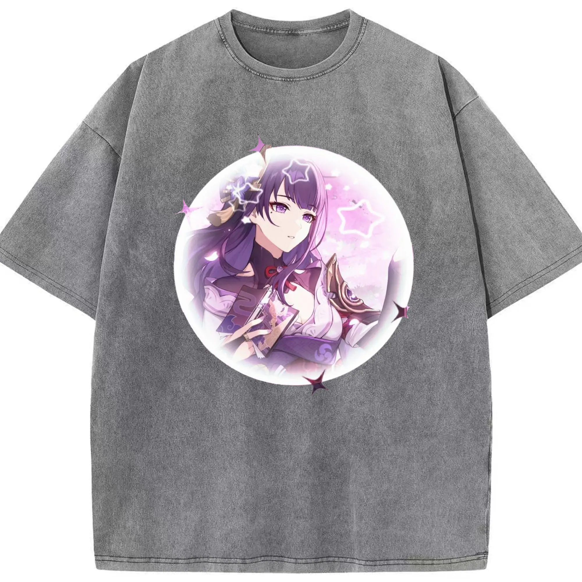 Genshinイナズマ 雷電将軍 - 綿100% ヴィンテージ風 半袖Tシャツ ・ フロントプリント ・ 柔らか肌触り ・ 通気性 快適 ・ スポーツ カジュアル 外出用
