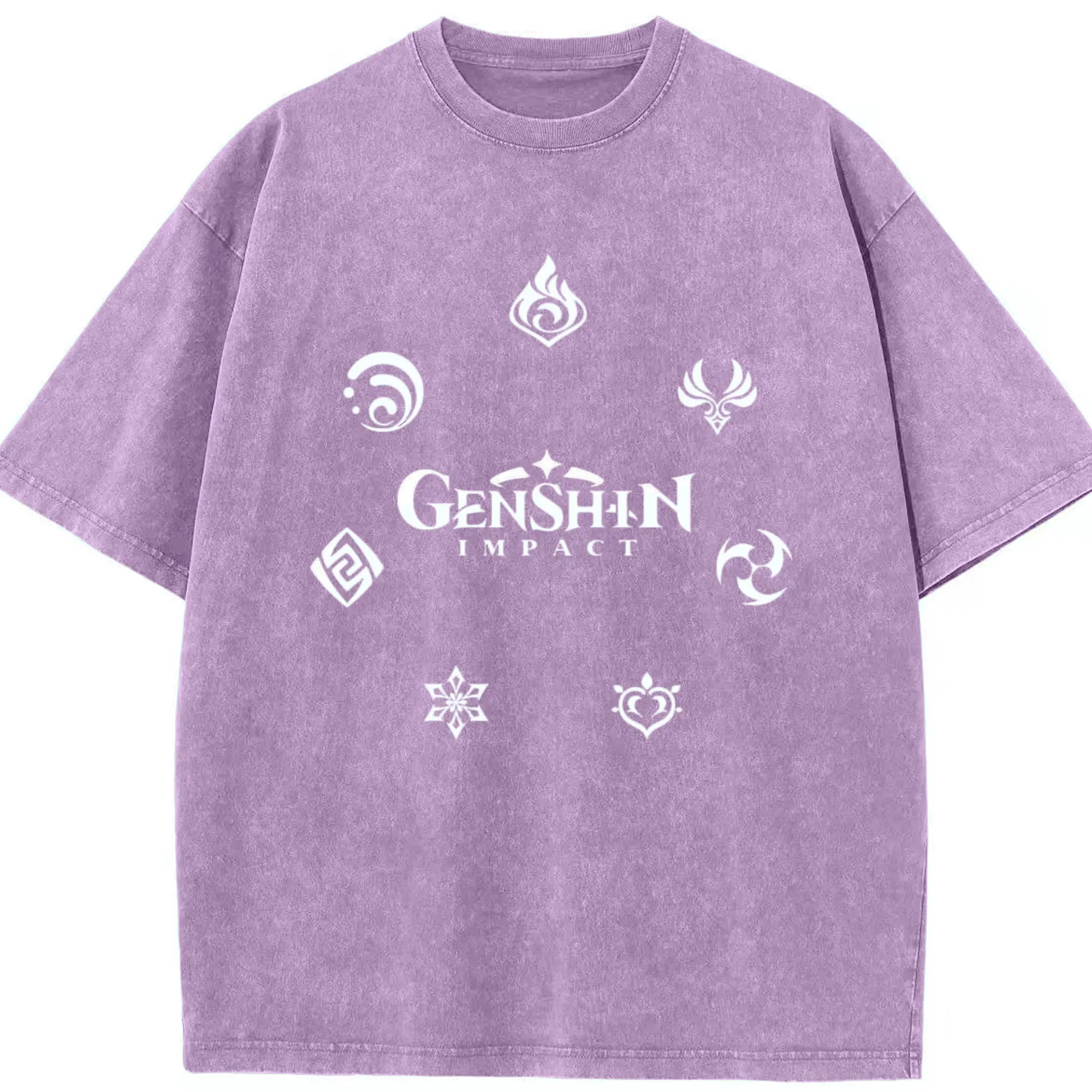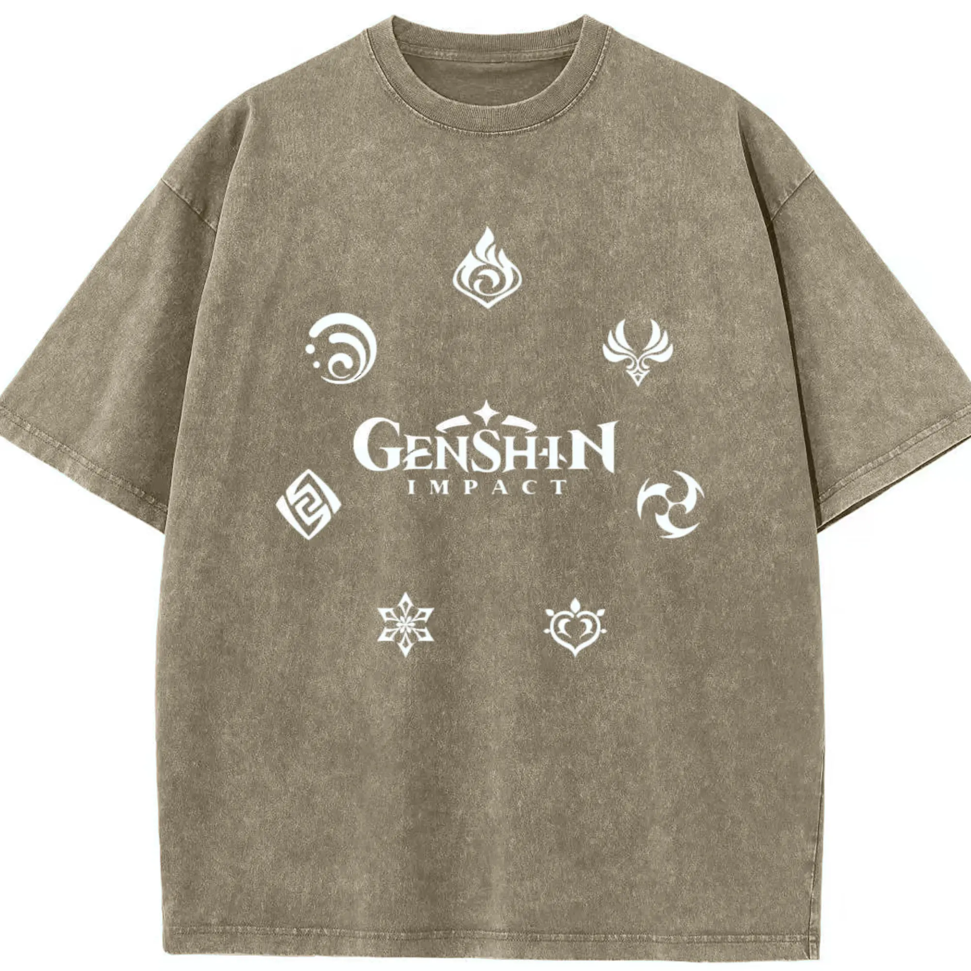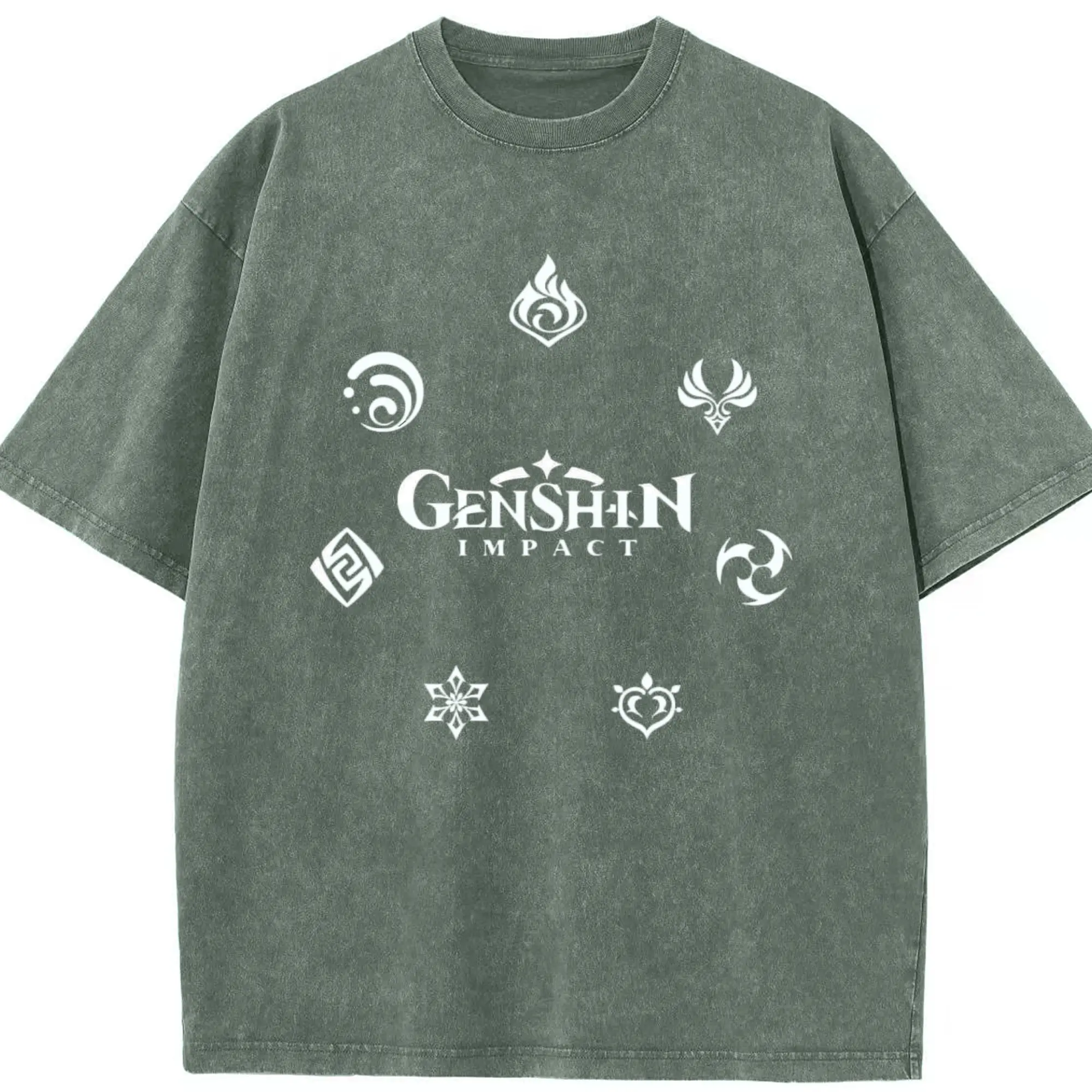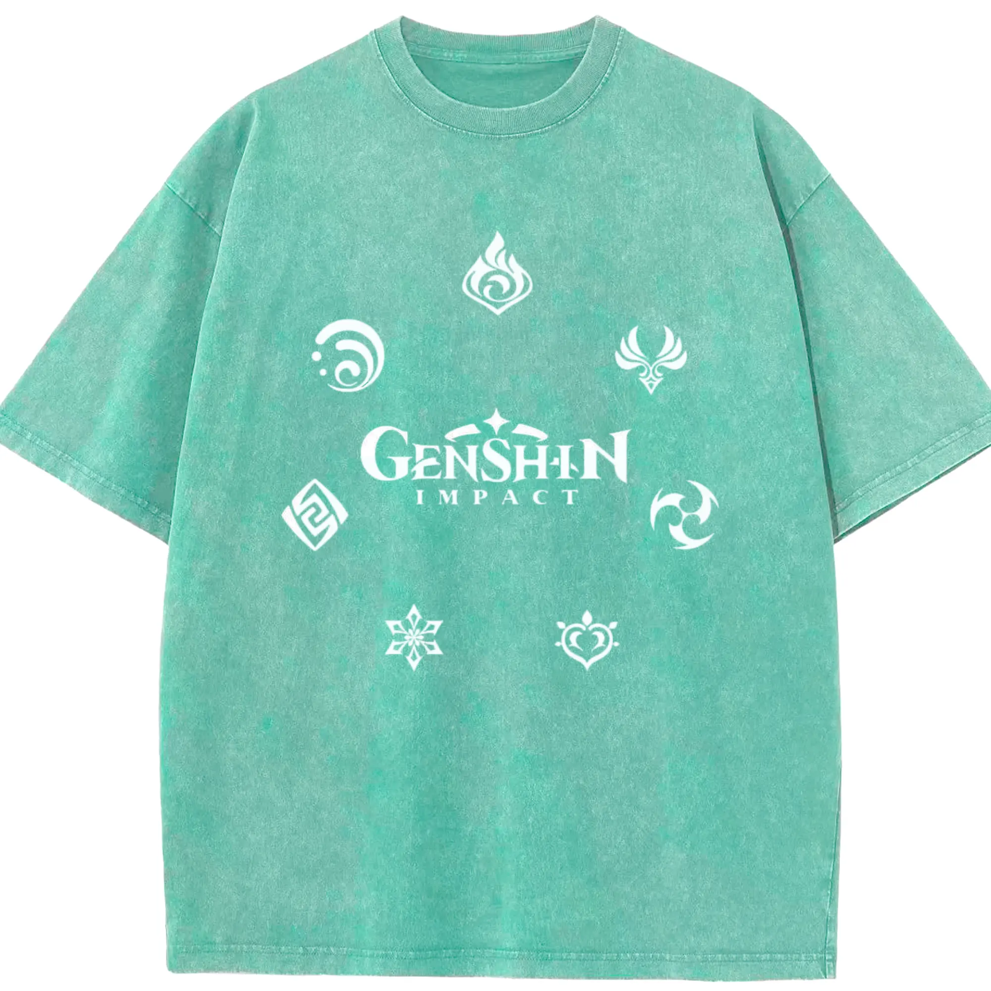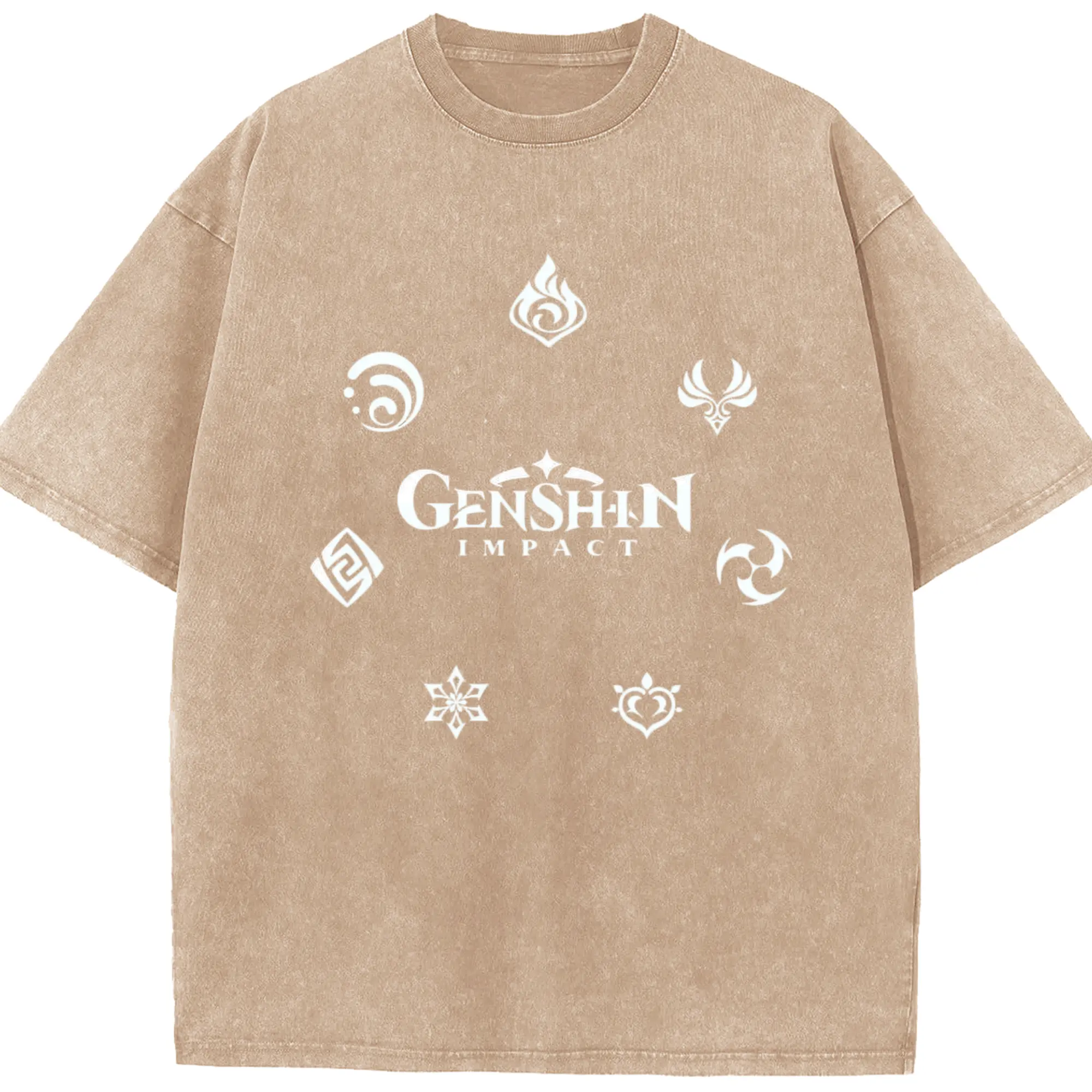 Genshin シンプルロゴ - 綿100% ヴィンテージ風 半袖Tシャツ ・ フロントプリント ・ 柔らか肌触り ・ 通気性 快適 ・ スポーツ カジュアル 外出用