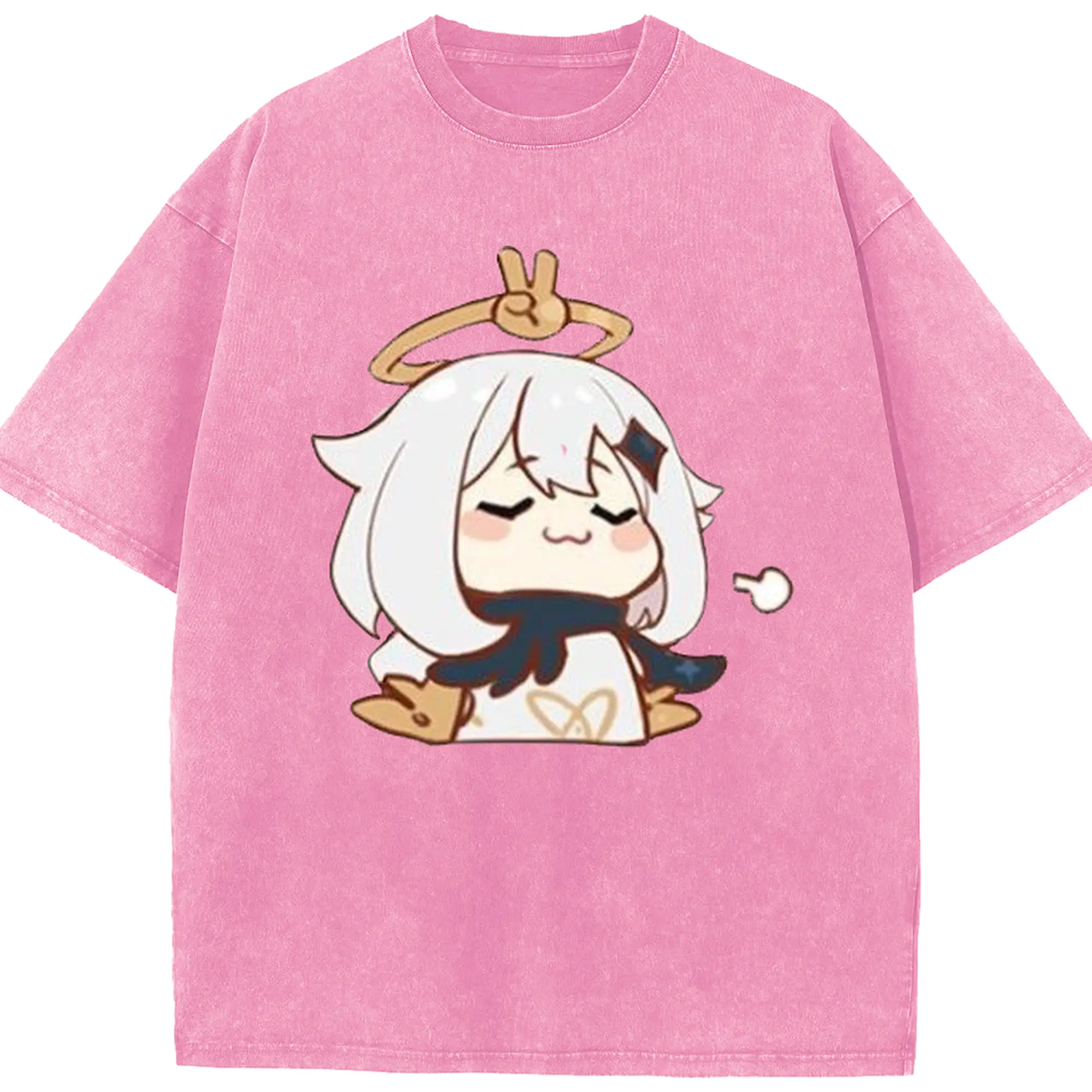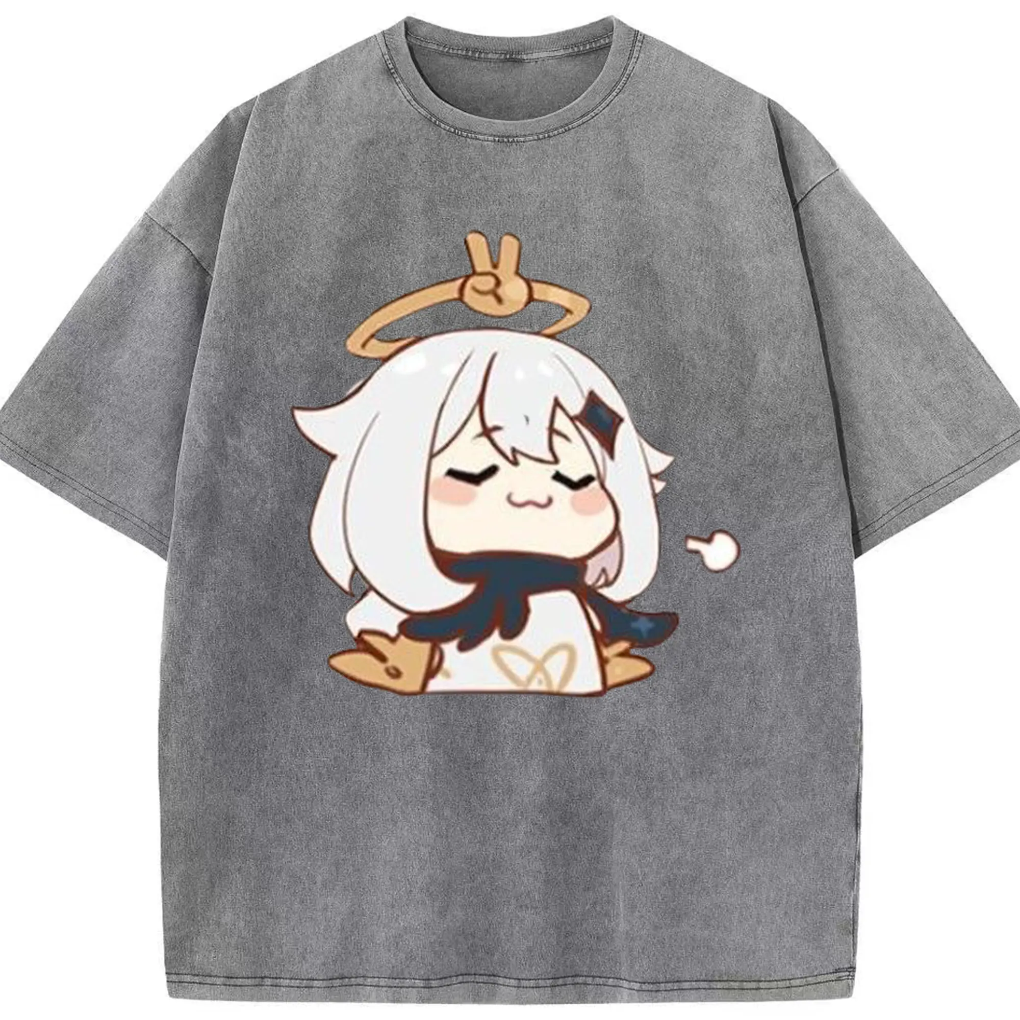Genshin パイモン - 綿100% ヴィンテージ風 半袖Tシャツ ・ フロントプリント ・ 柔らか肌触り ・ 通気性 快適 ・ スポーツ カジュアル 外出用