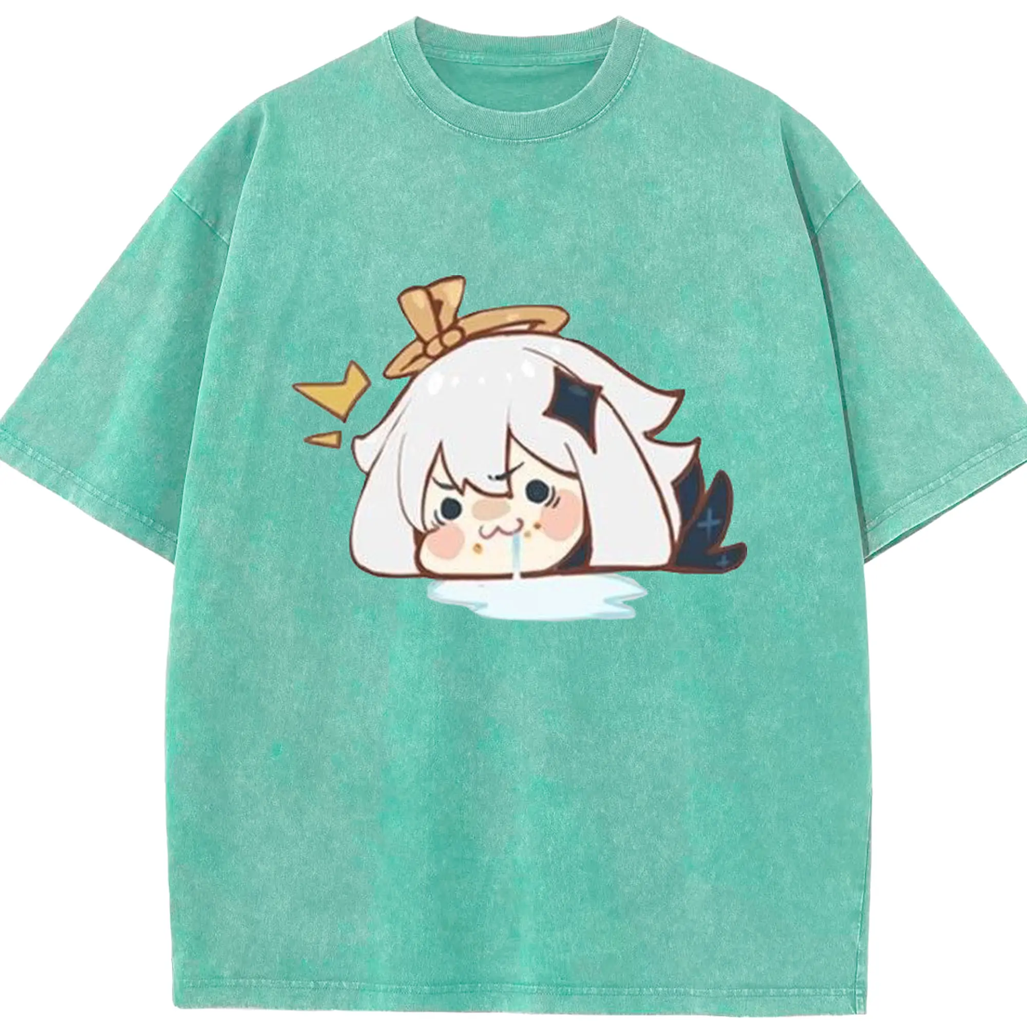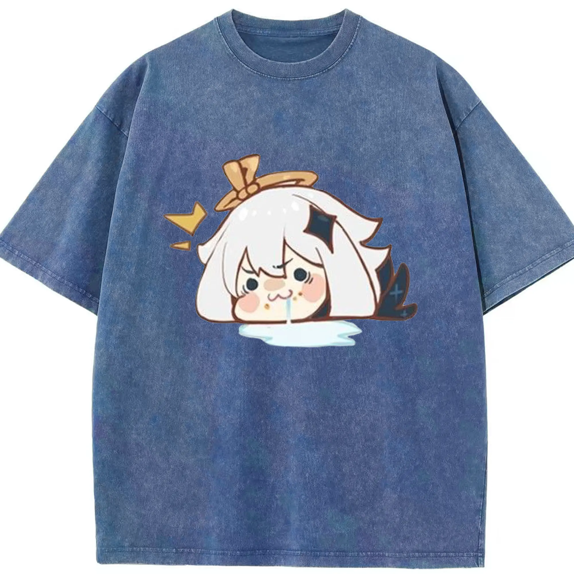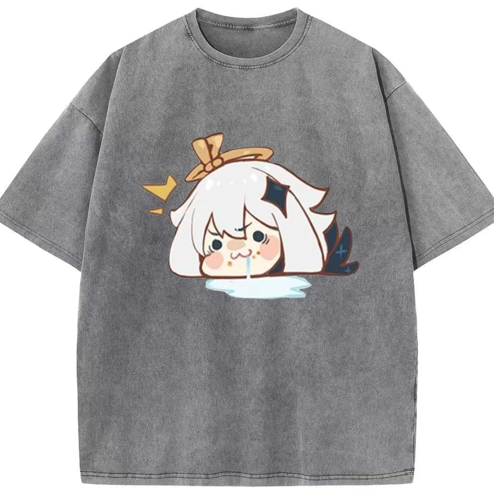 Genshin パイモン - 綿100% ヴィンテージ風 半袖Tシャツ ・ フロントプリント ・ 柔らか肌触り ・ 通気性 快適 ・ スポーツ カジュアル 外出用