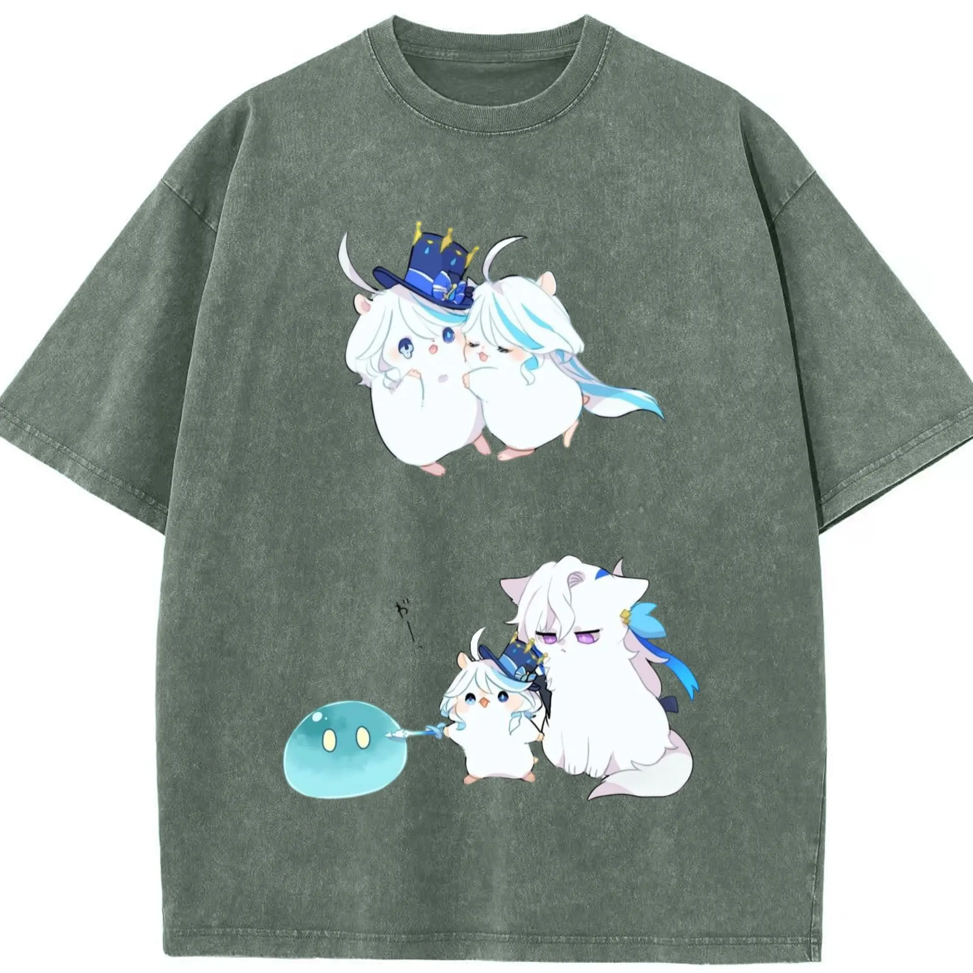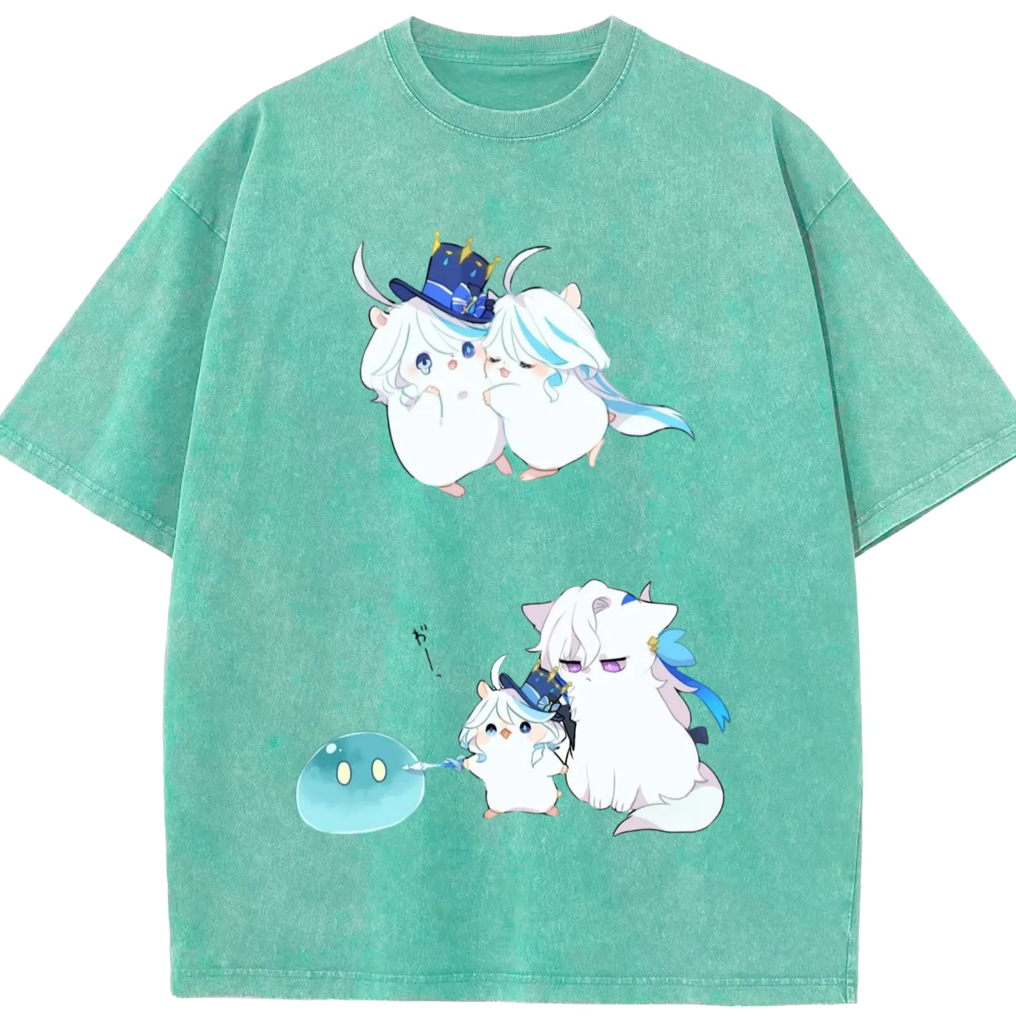 Genshin フォンテーヌ 水神すいじんフォカロルス フリーナ ヌヴィレット - 綿100% ヴィンテージ風 半袖Tシャツ ・ フロントプリント ・ 柔らか肌触り ・ 通気性 快適 ・ スポーツ カジュアル 外出用