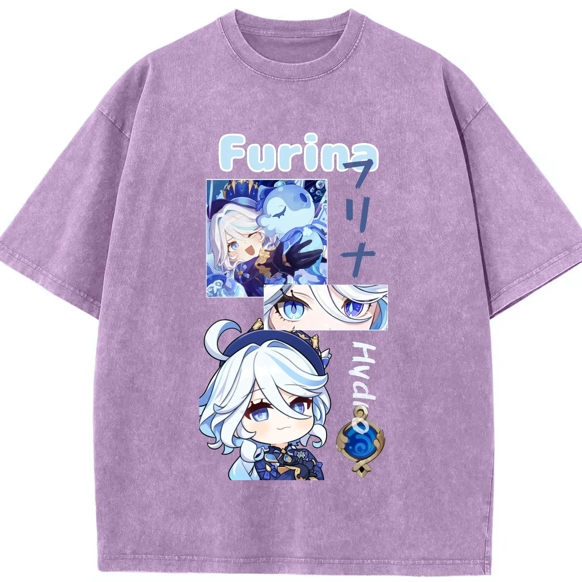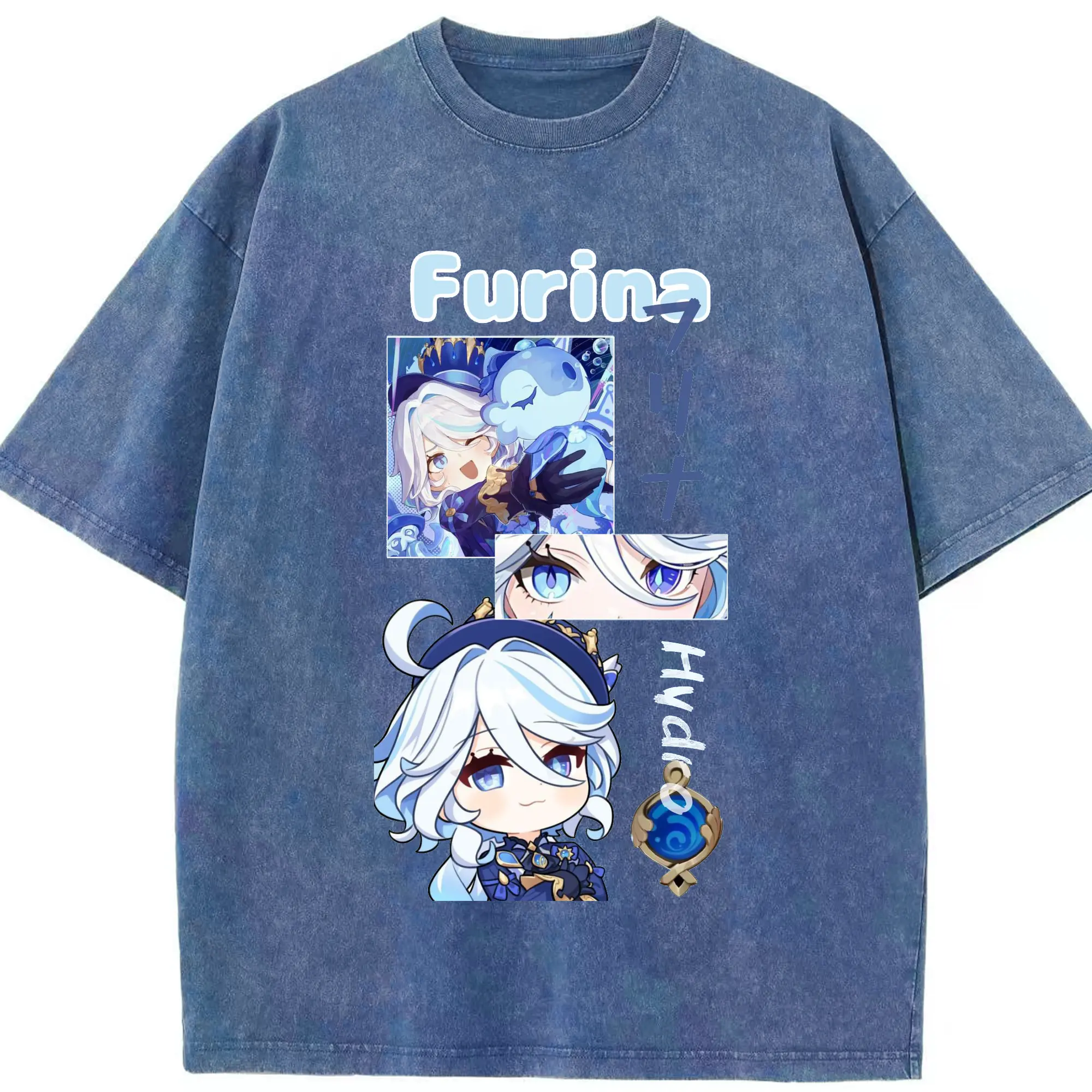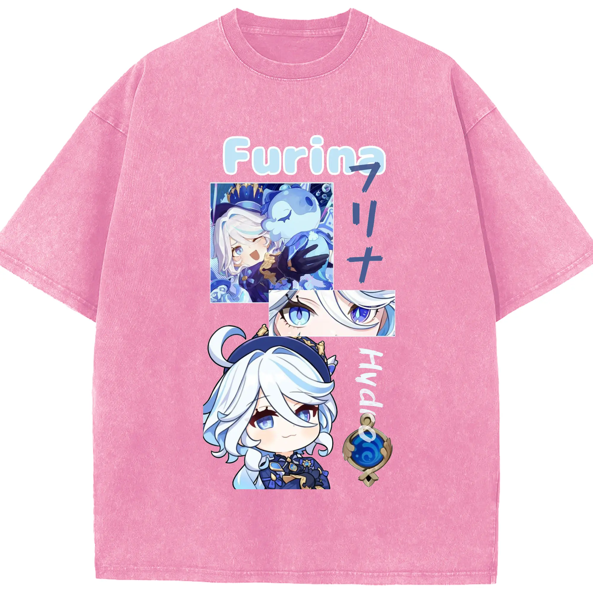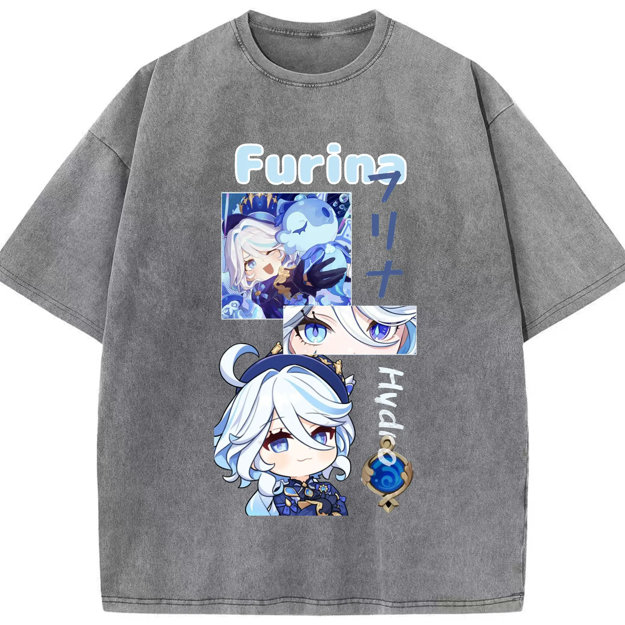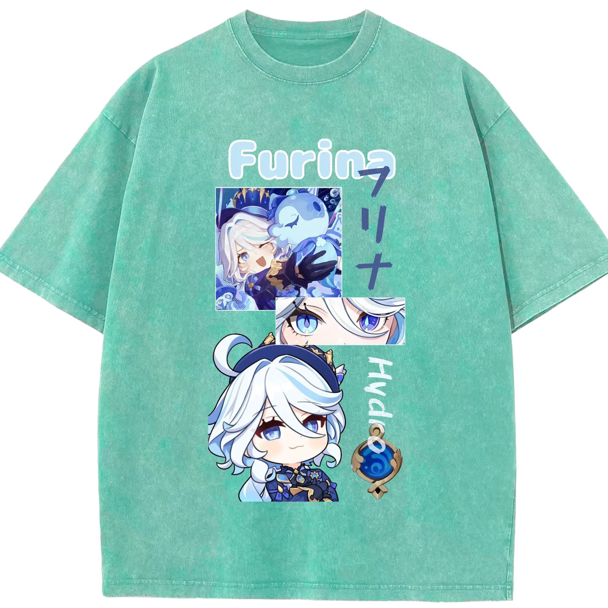 Genshin フォンテーヌ 水神すいじんフォカロルス フリーナ - 綿100% ヴィンテージ風 半袖Tシャツ ・ フロントプリント ・ 柔らか肌触り ・ 通気性 快適 ・ スポーツ カジュアル 外出用