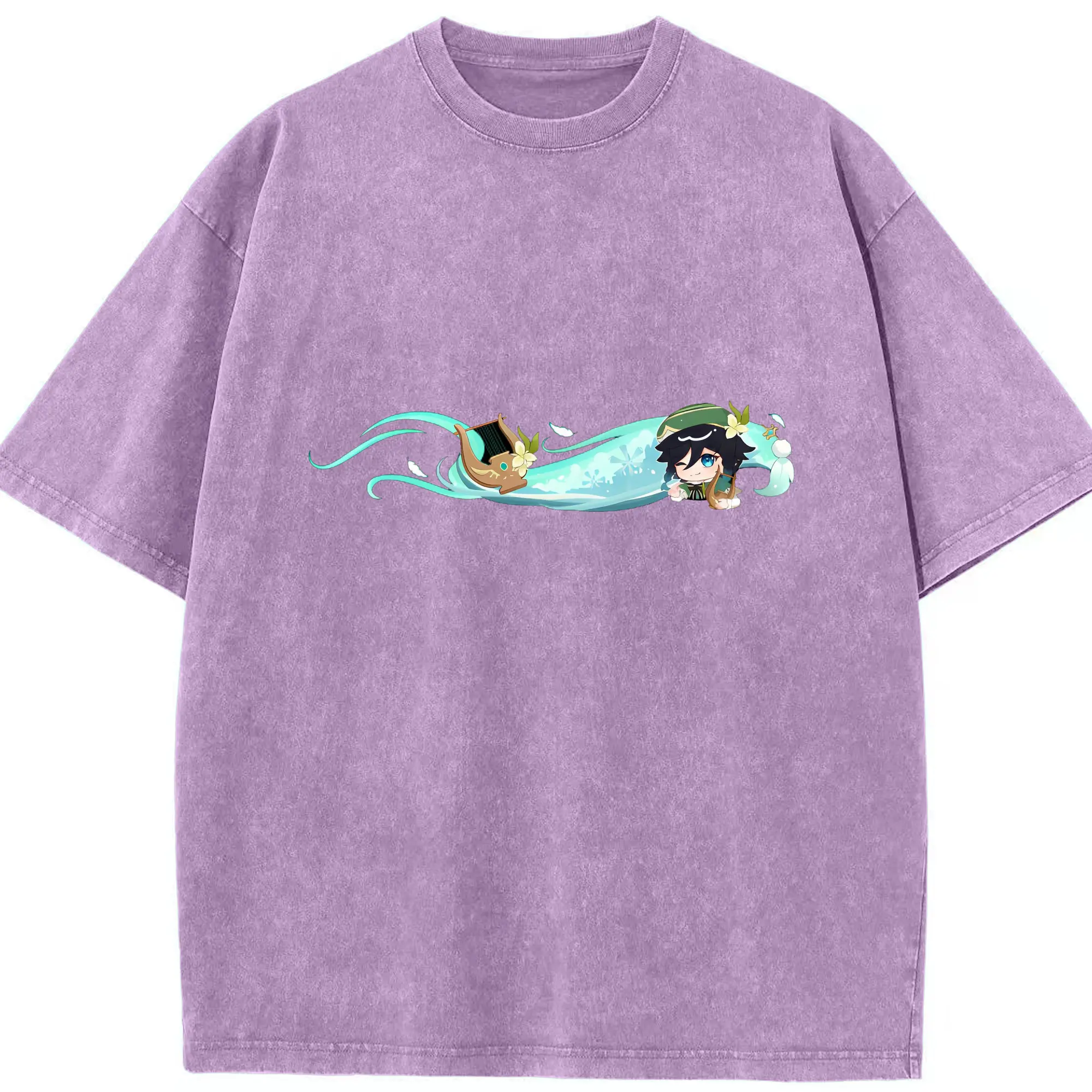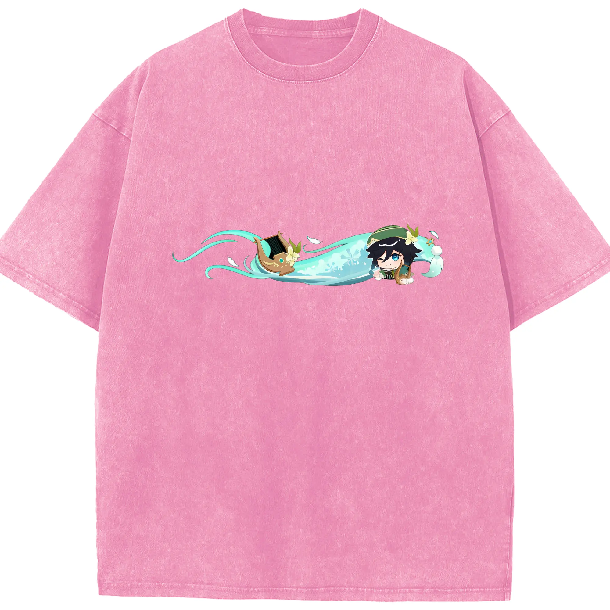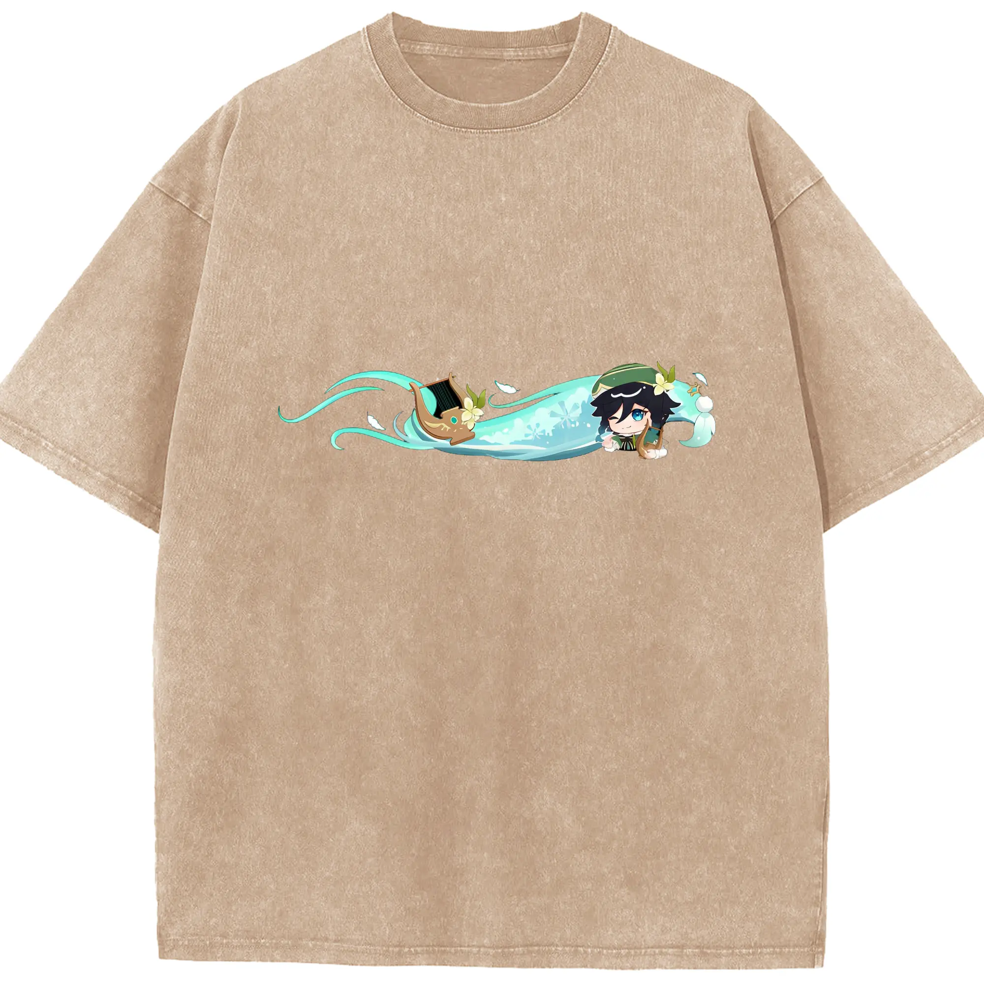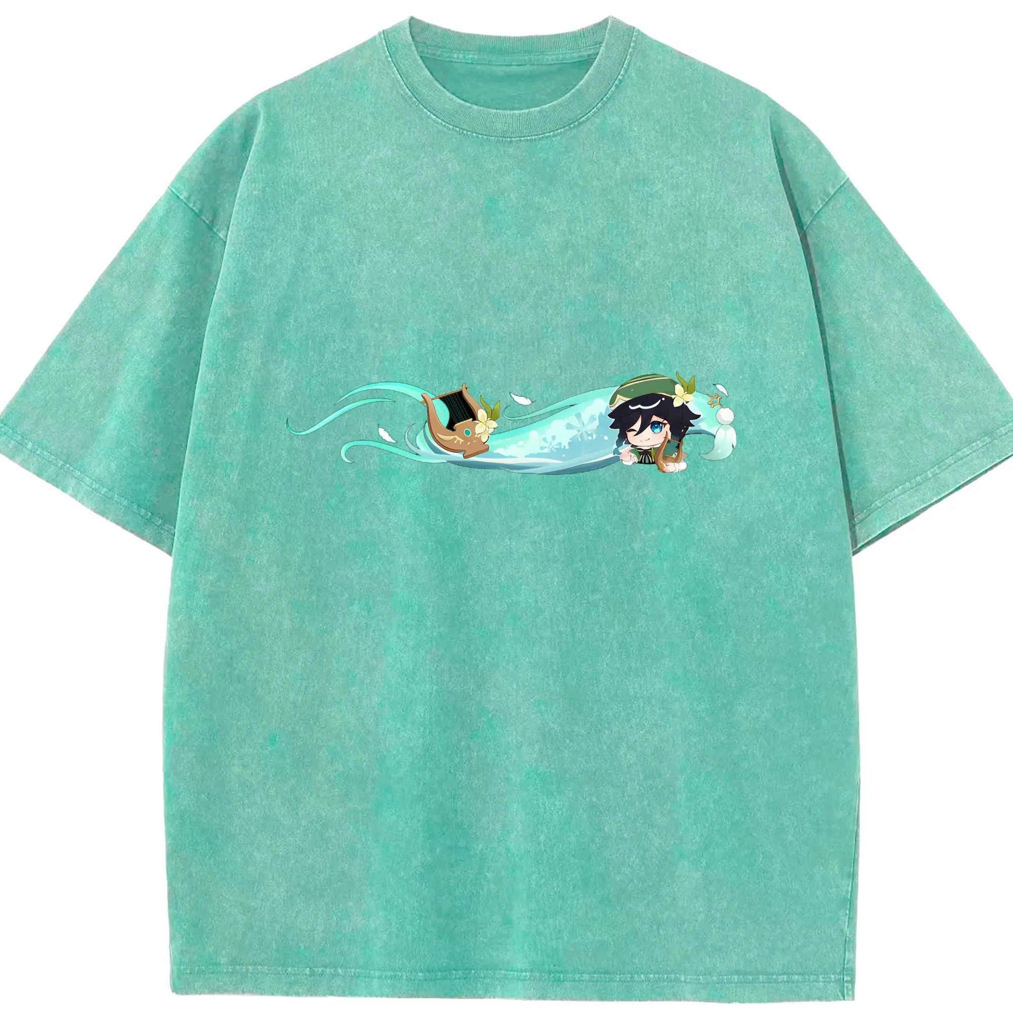 Genshin モンド 風神ふうじん バルバトス - 綿100% ヴィンテージ風 半袖Tシャツ ・ フロントプリント ・ 柔らか肌触り ・ 通気性 快適 ・ スポーツ カジュアル 外出用