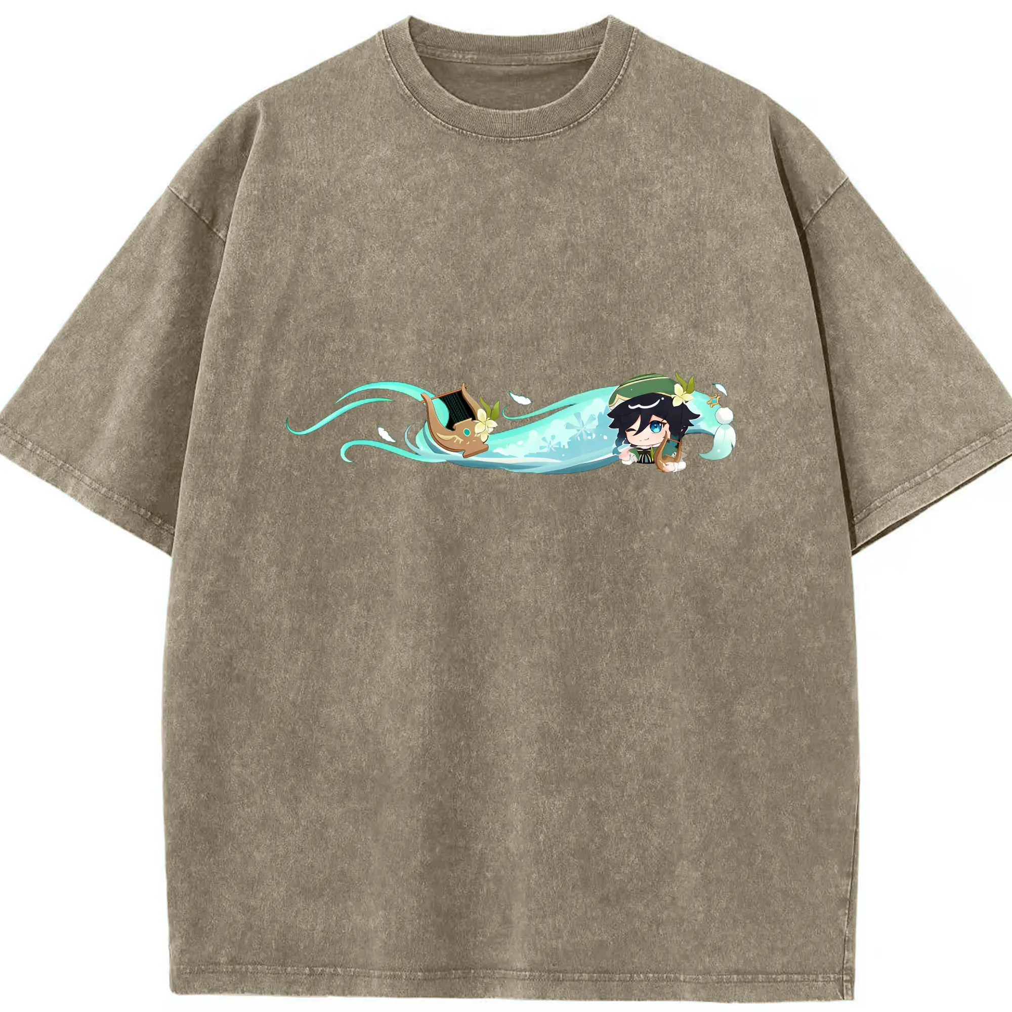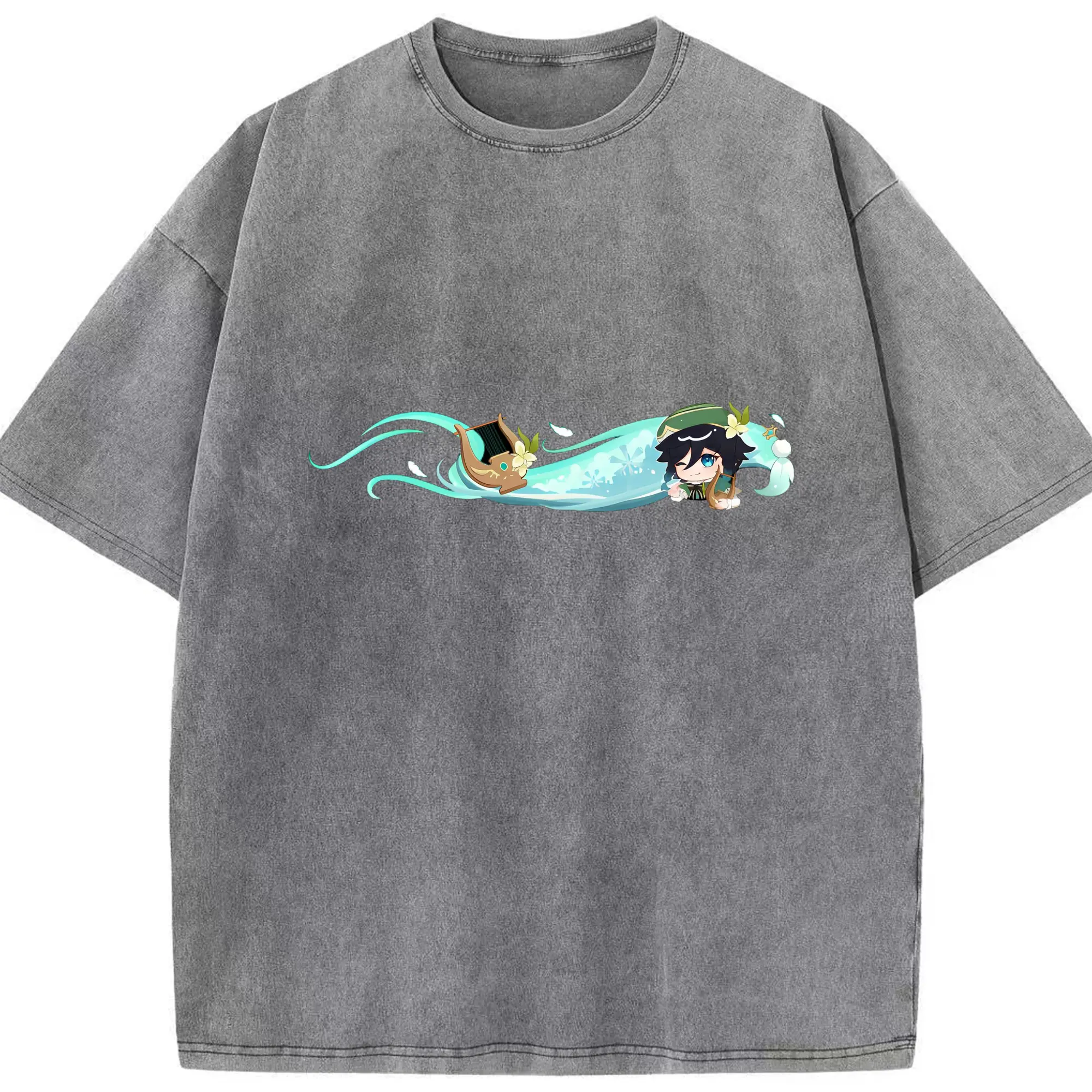 Genshin モンド 風神ふうじん バルバトス - 綿100% ヴィンテージ風 半袖Tシャツ ・ フロントプリント ・ 柔らか肌触り ・ 通気性 快適 ・ スポーツ カジュアル 外出用