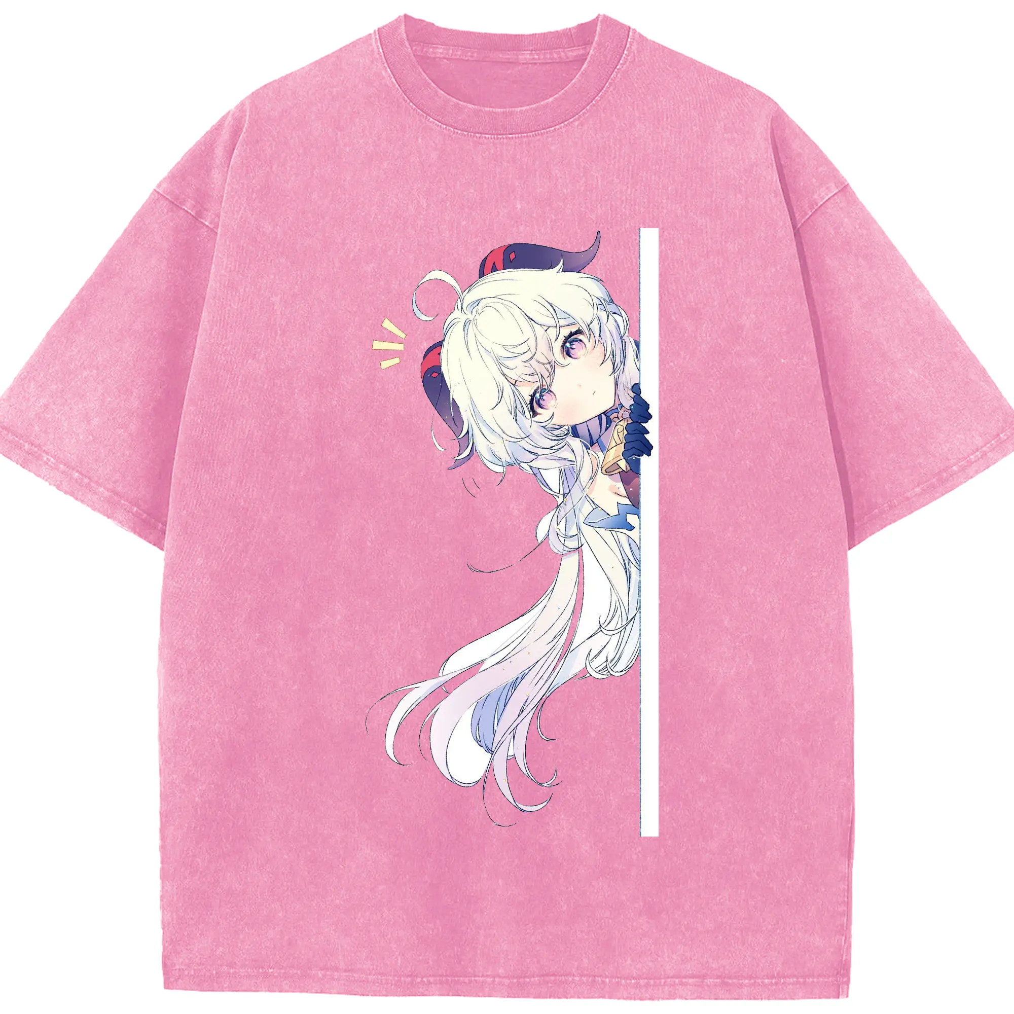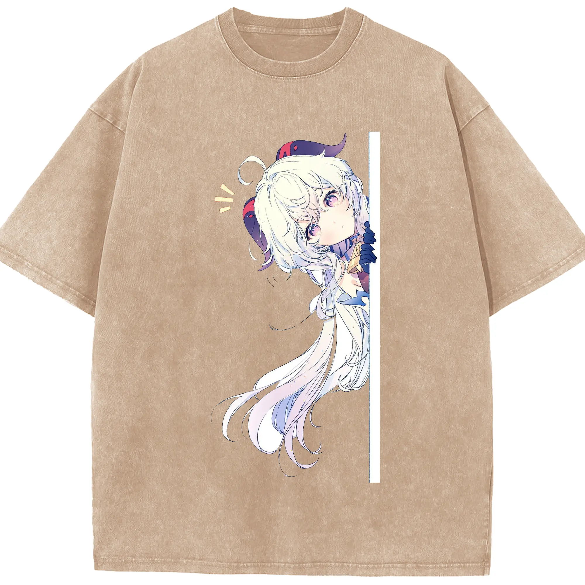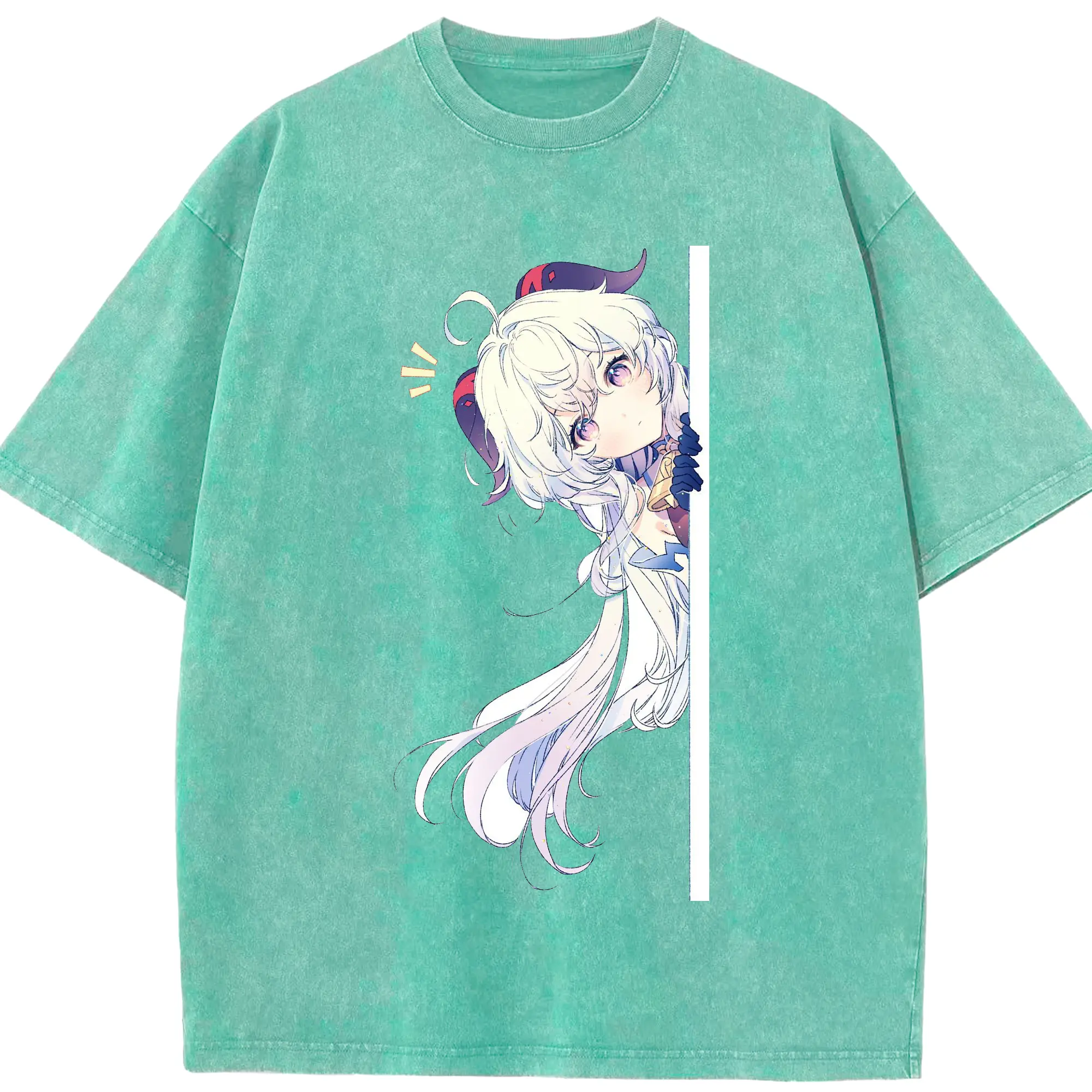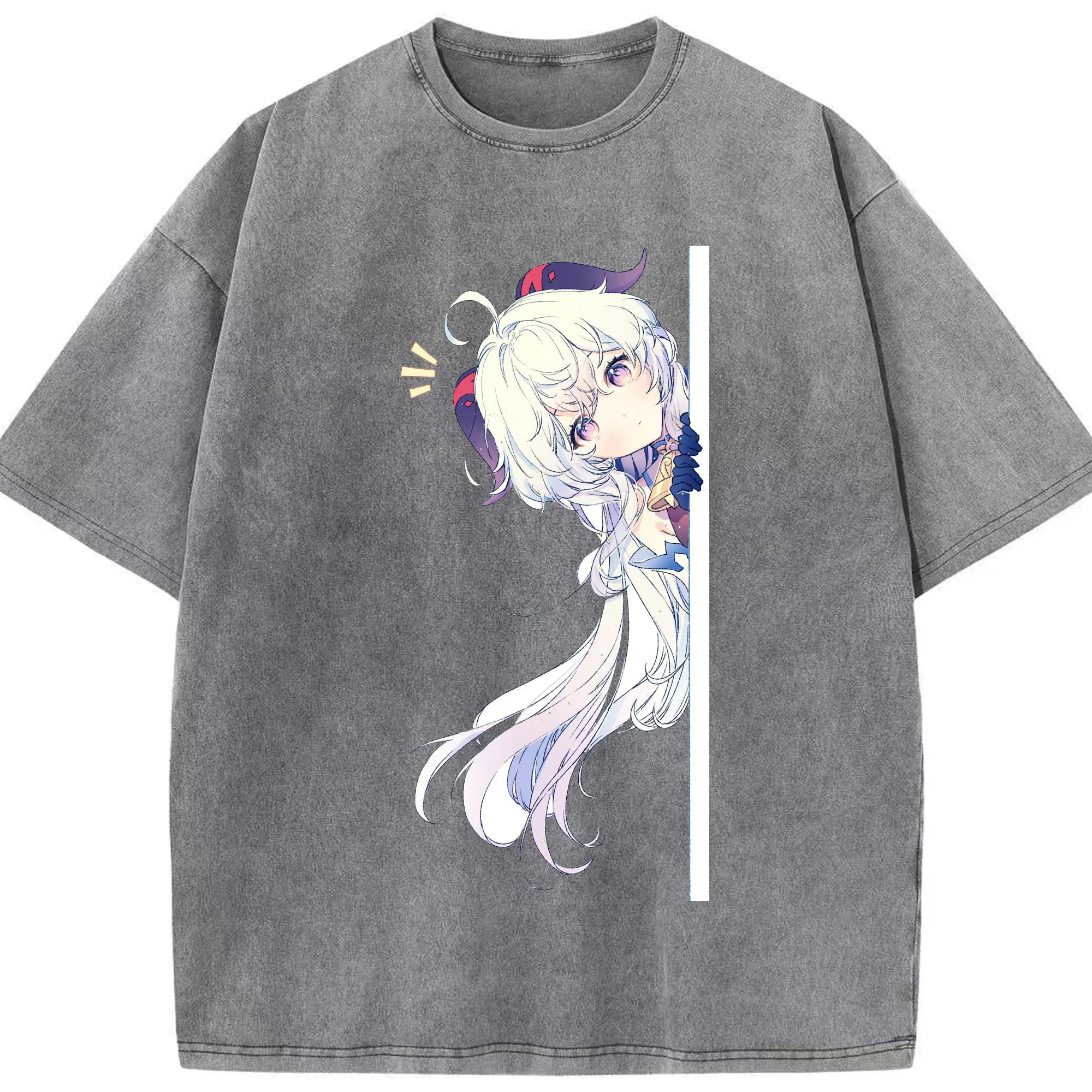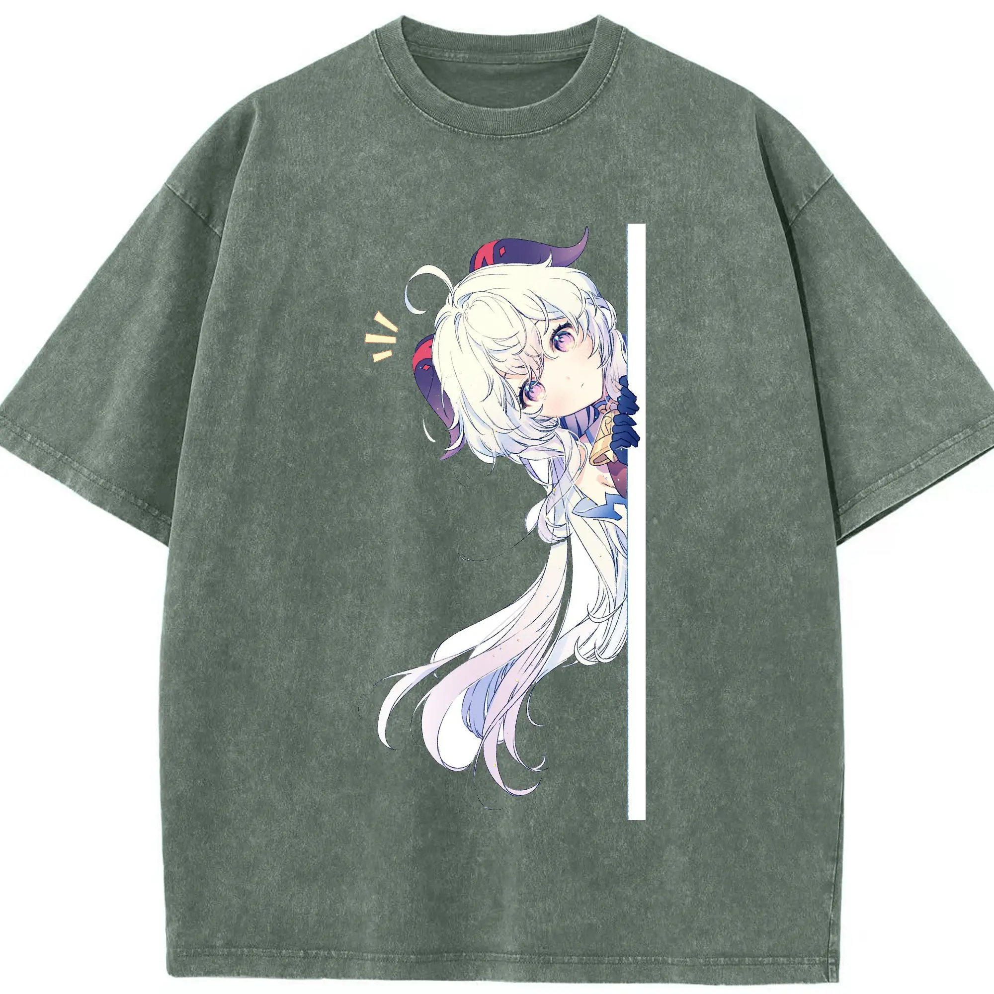 Genshin リーユエ 甘雨 見つかる瞬間 - 綿100% ヴィンテージ風 半袖Tシャツ ・ フロントプリント ・ 柔らか肌触り ・ 通気性 快適 ・ スポーツ カジュアル 外出用