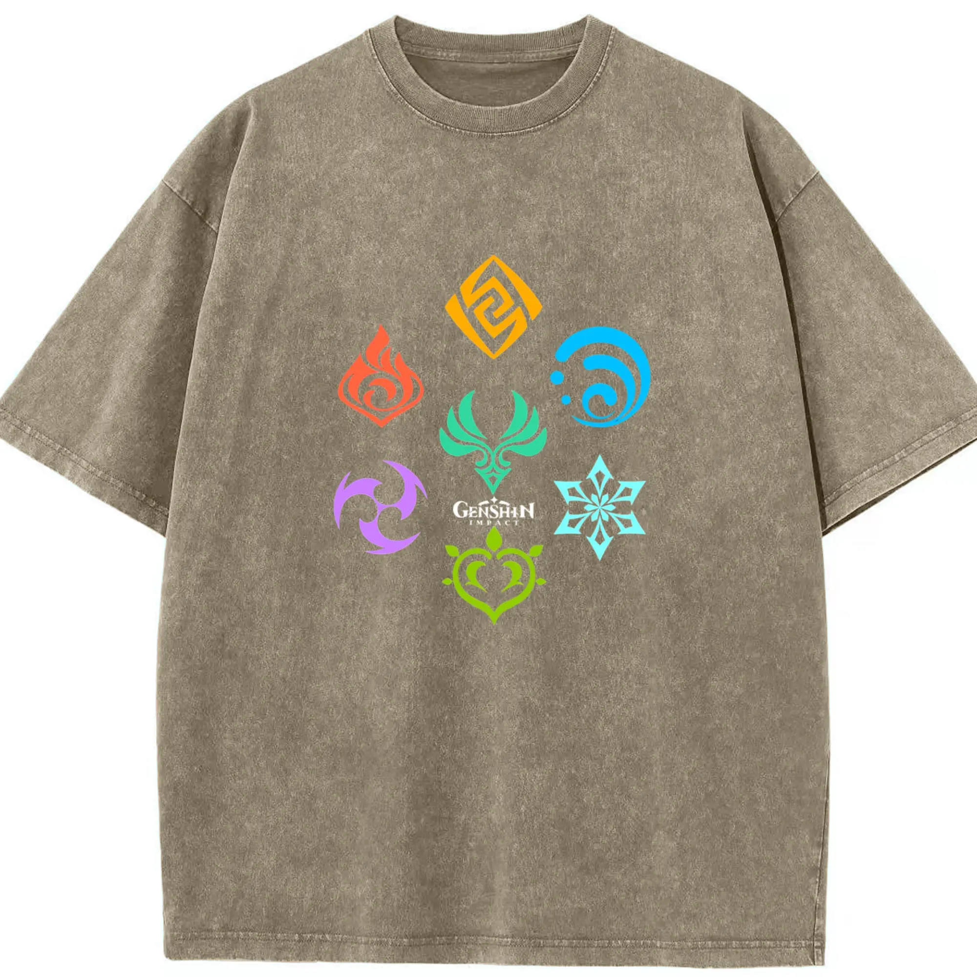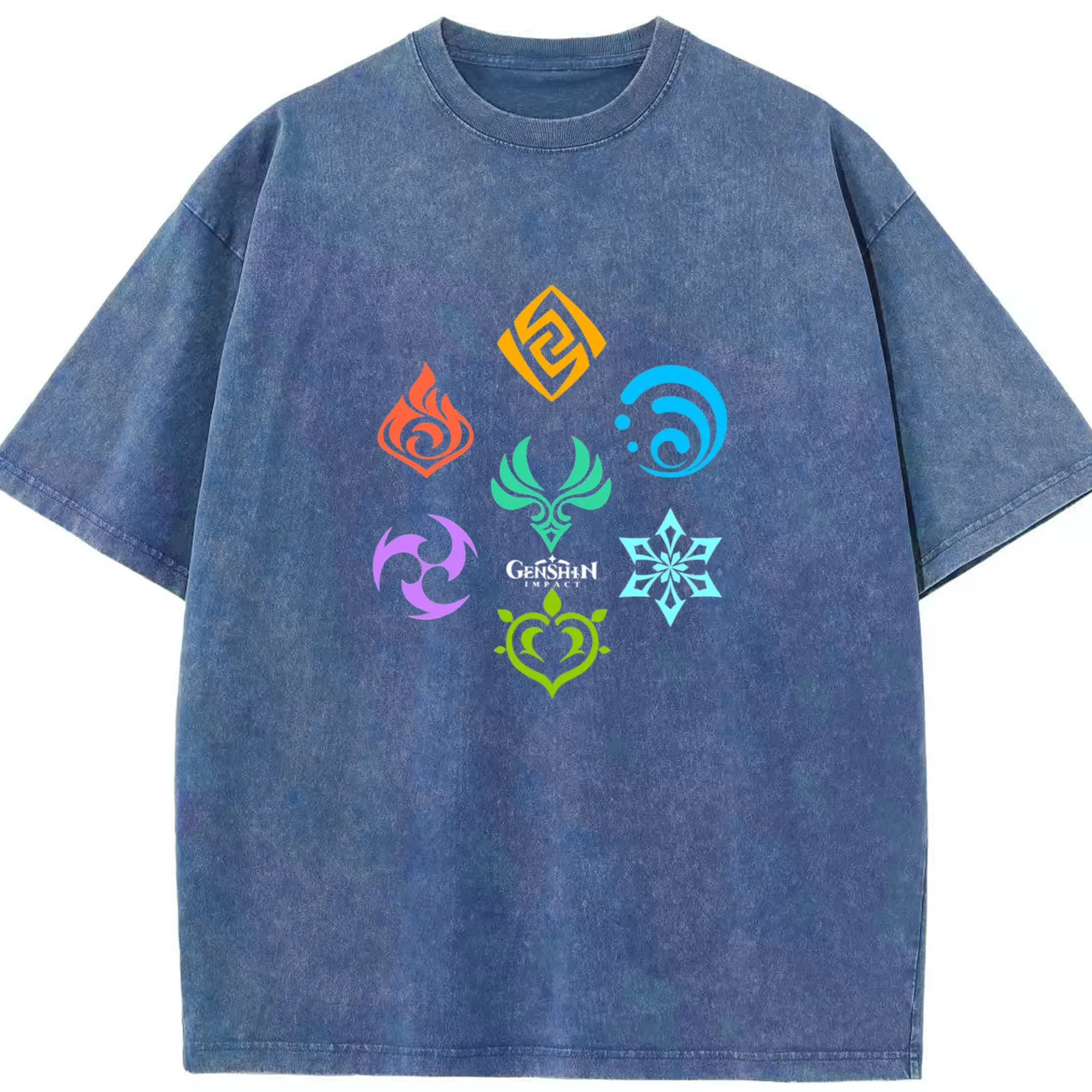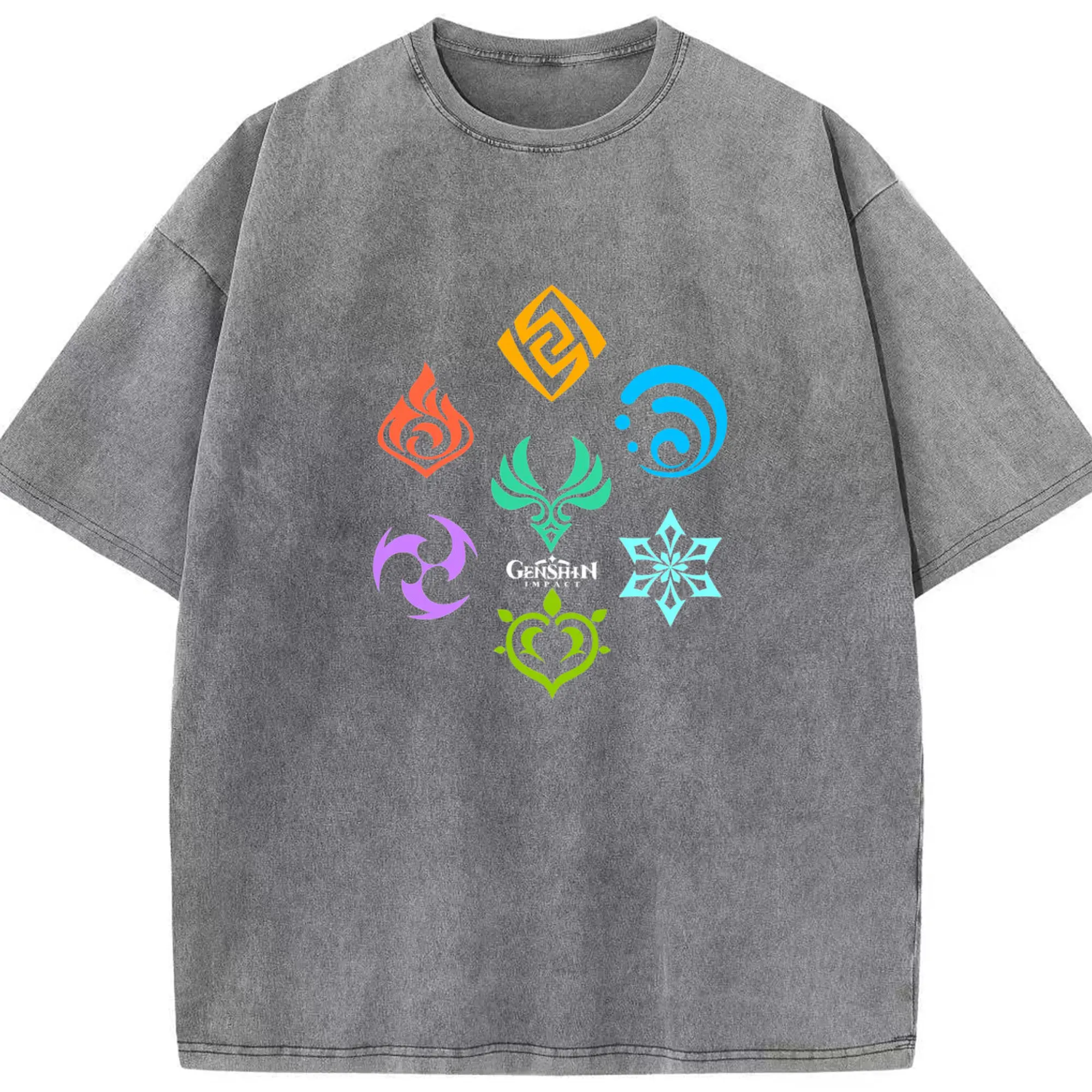 Genshin 原神の七元素ロゴ - 綿100% ヴィンテージ風 半袖Tシャツ ・ フロントプリント ・ 柔らか肌触り ・ 通気性 快適 ・ スポーツ カジュアル 外出用