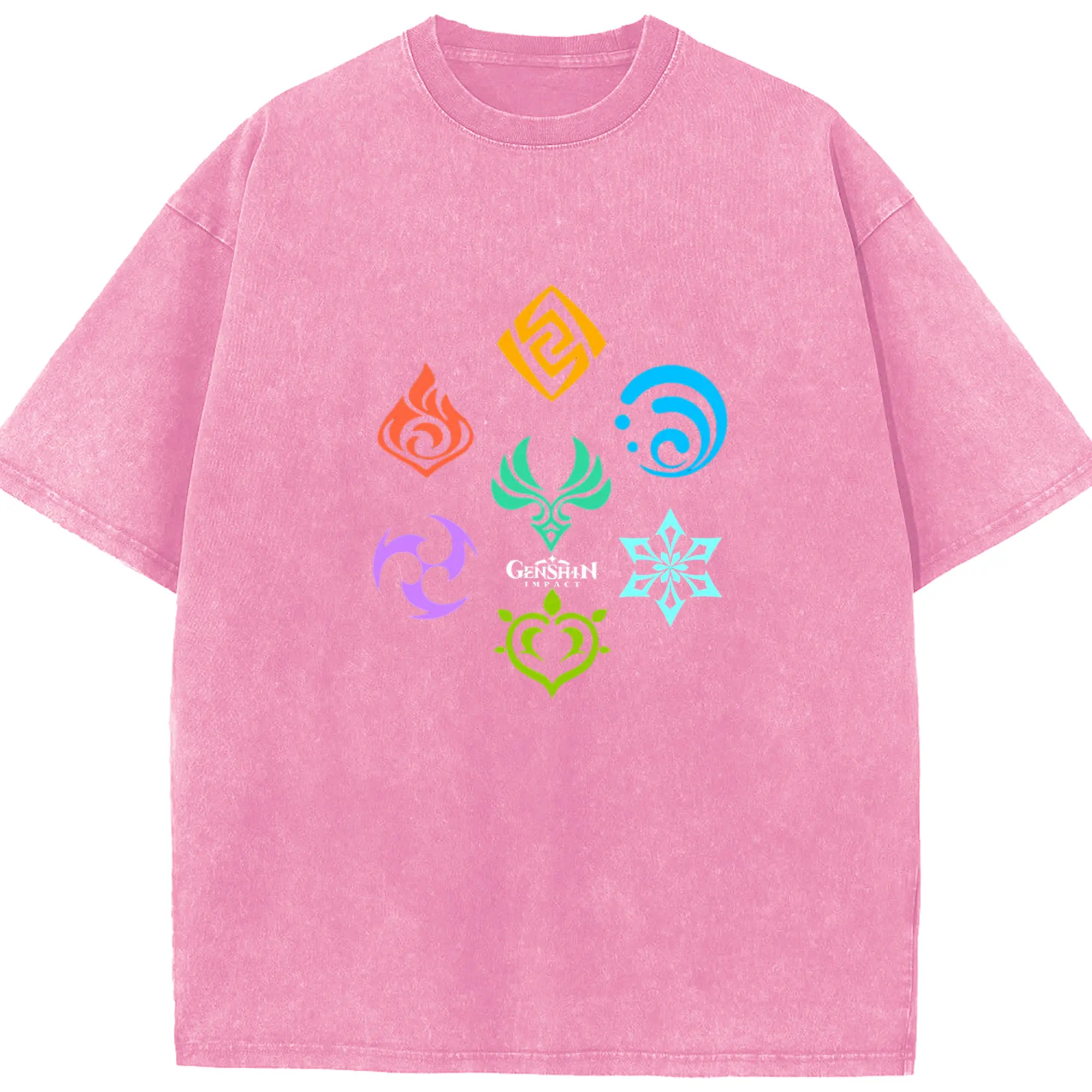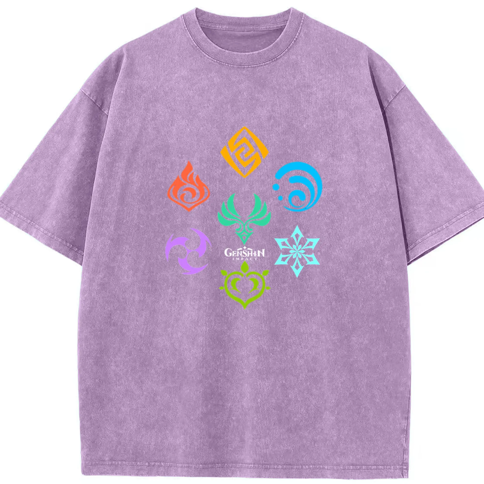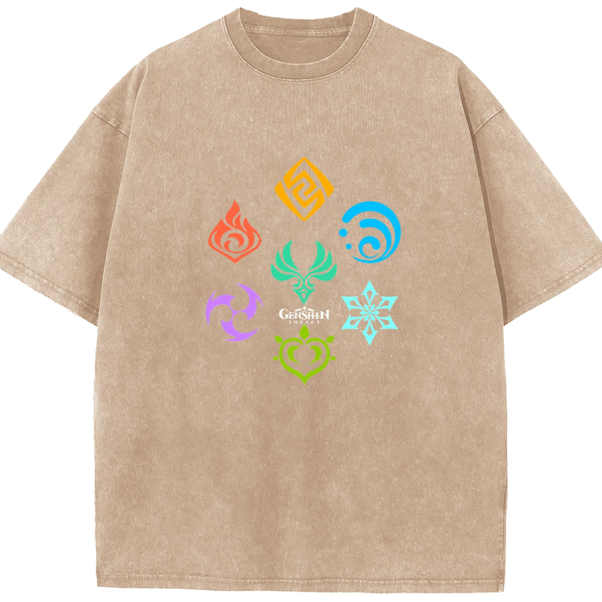 Genshin 原神の七元素ロゴ - 綿100% ヴィンテージ風 半袖Tシャツ ・ フロントプリント ・ 柔らか肌触り ・ 通気性 快適 ・ スポーツ カジュアル 外出用