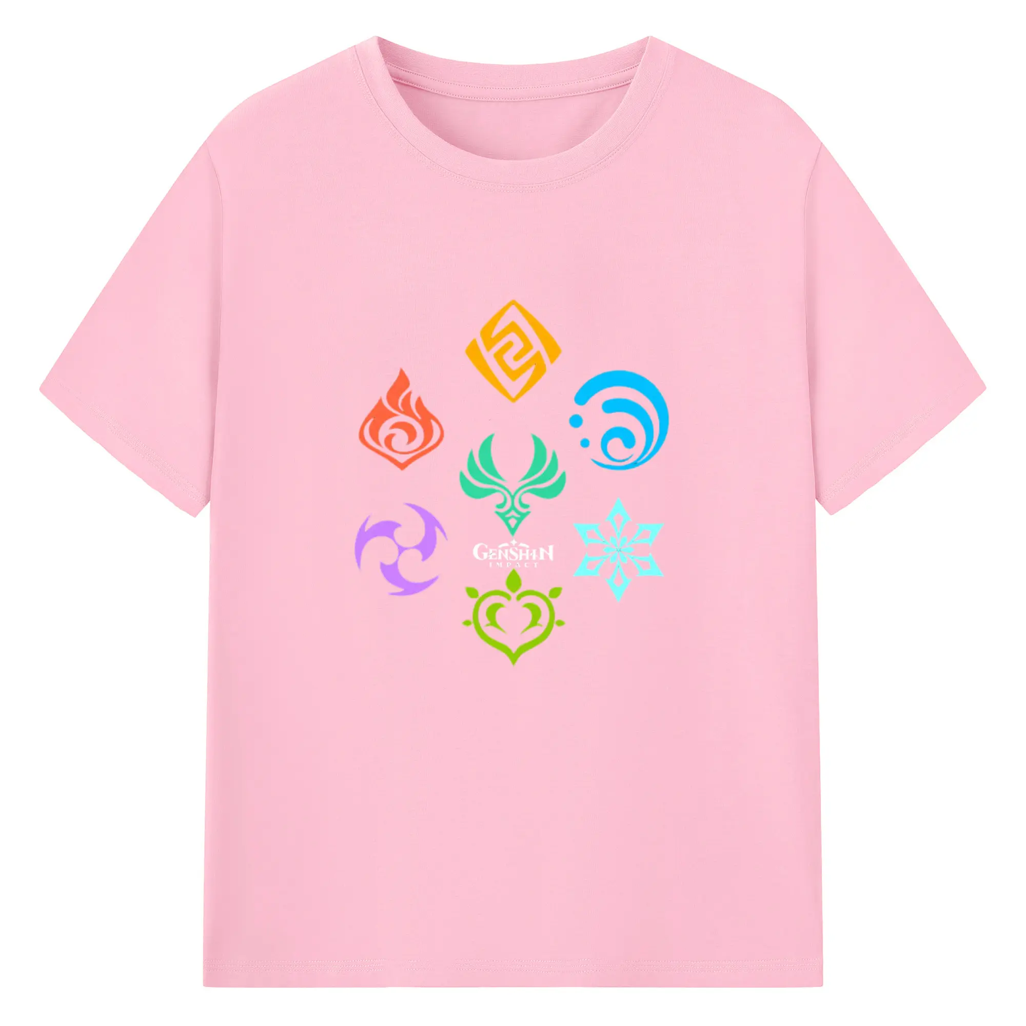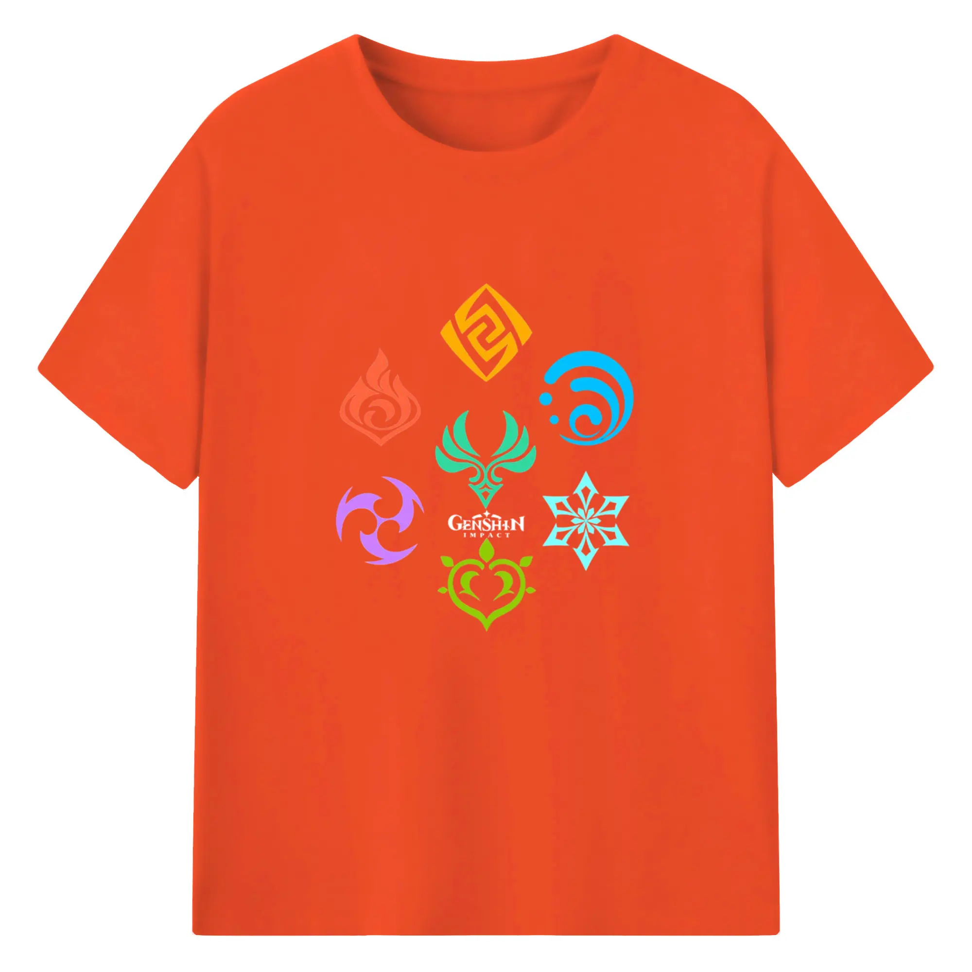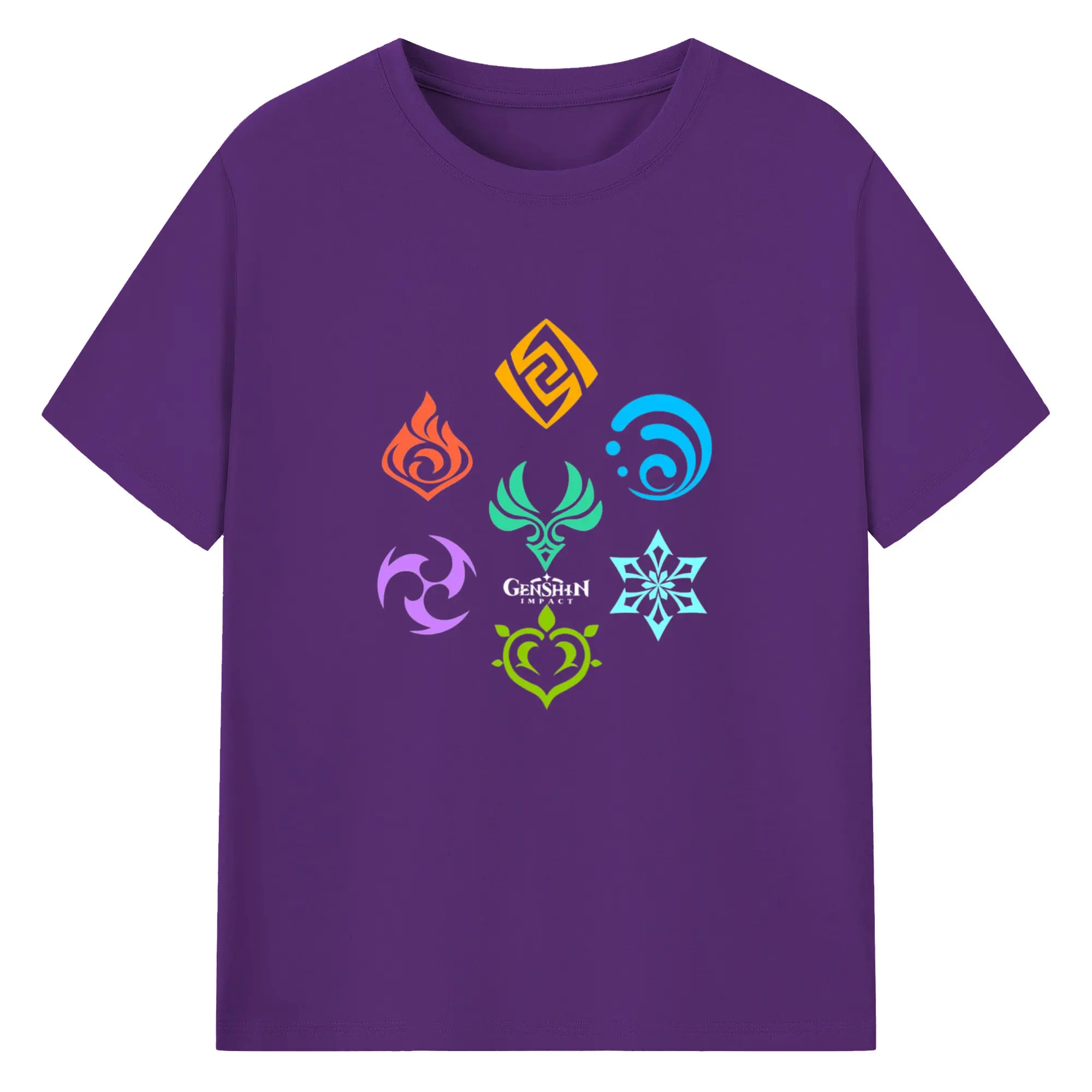 Genshin 原神の七元素ロゴ - 綿100% 半袖Tシャツ ・ フロントプリント ・ 快適 通気性 ・ 日常使い 散歩 スポーツ用