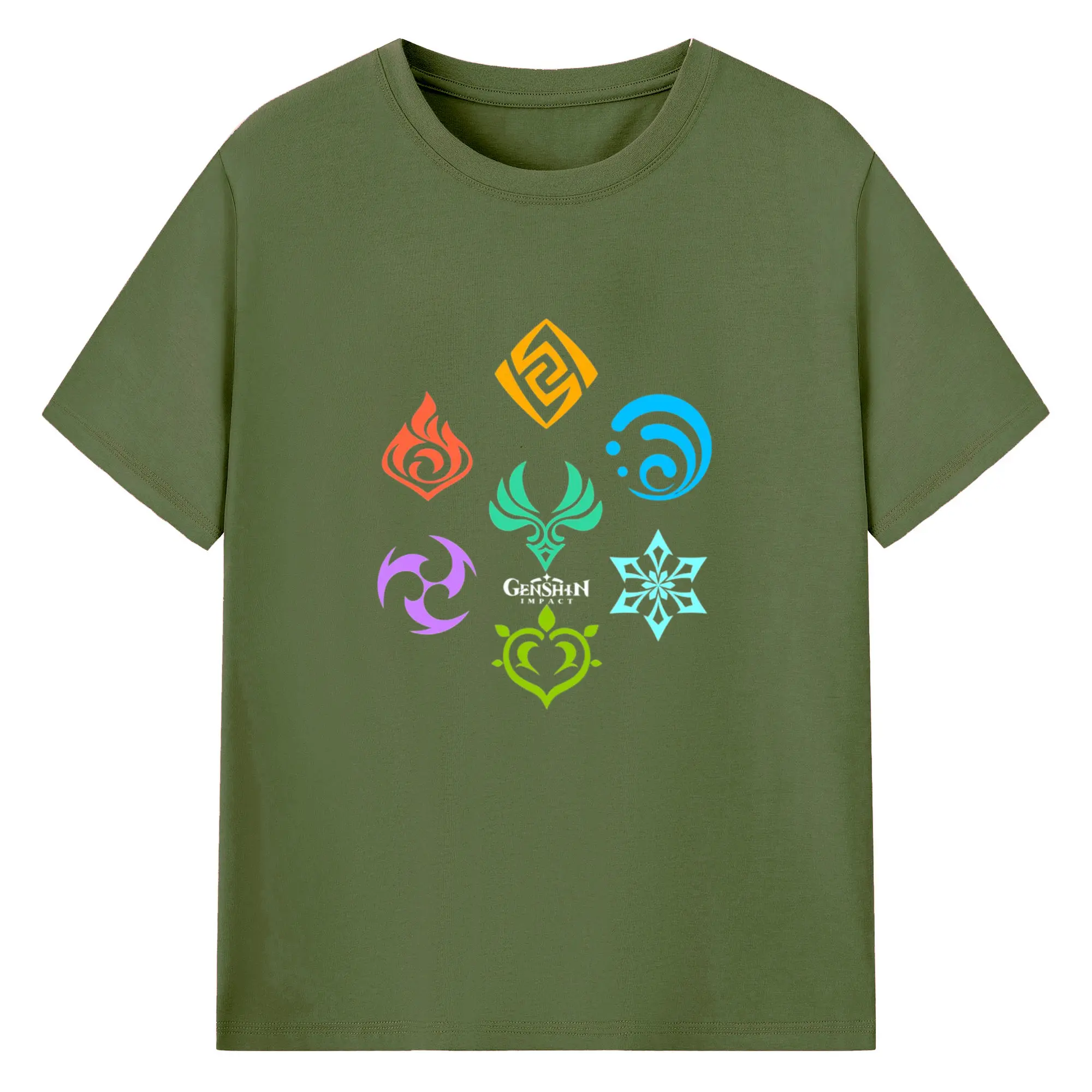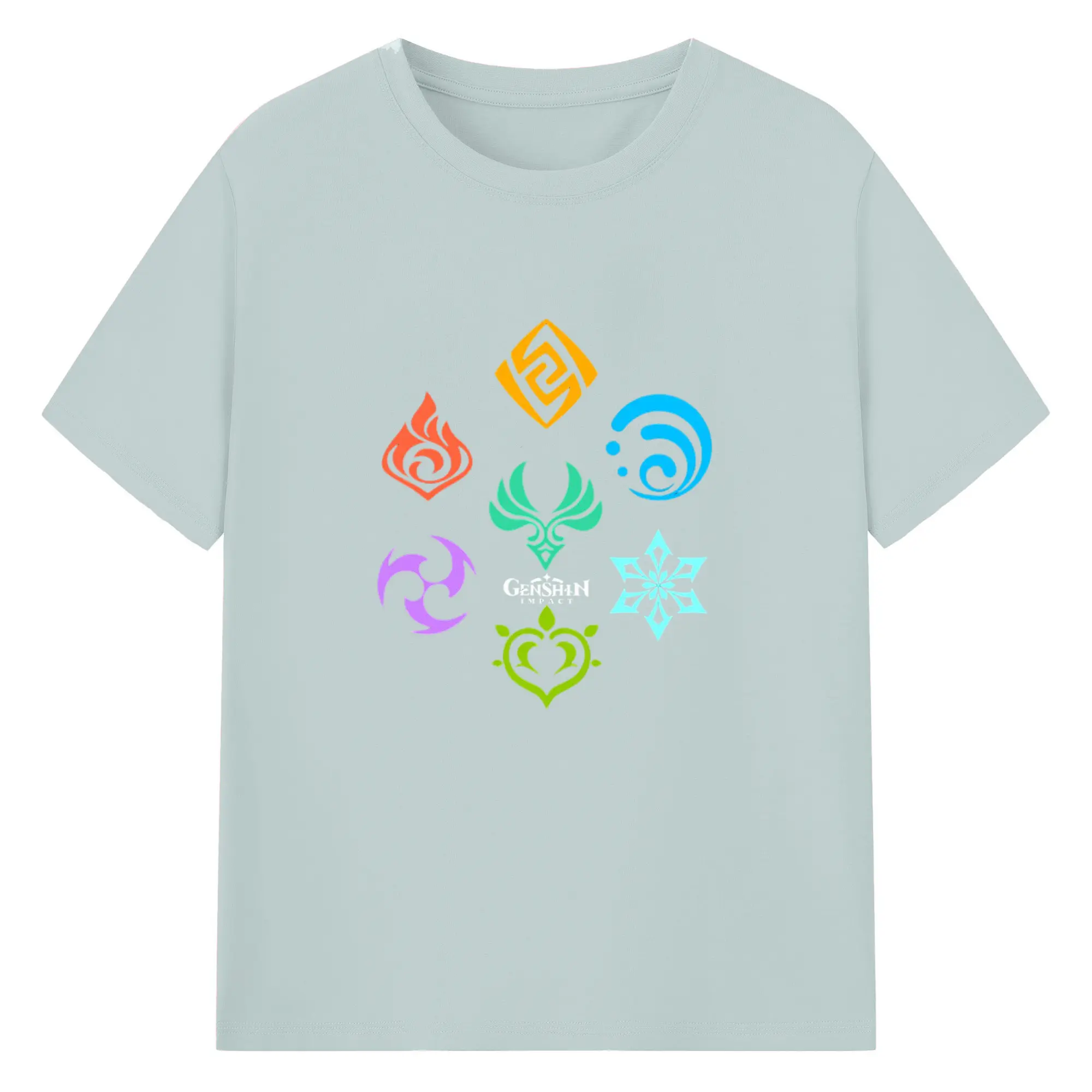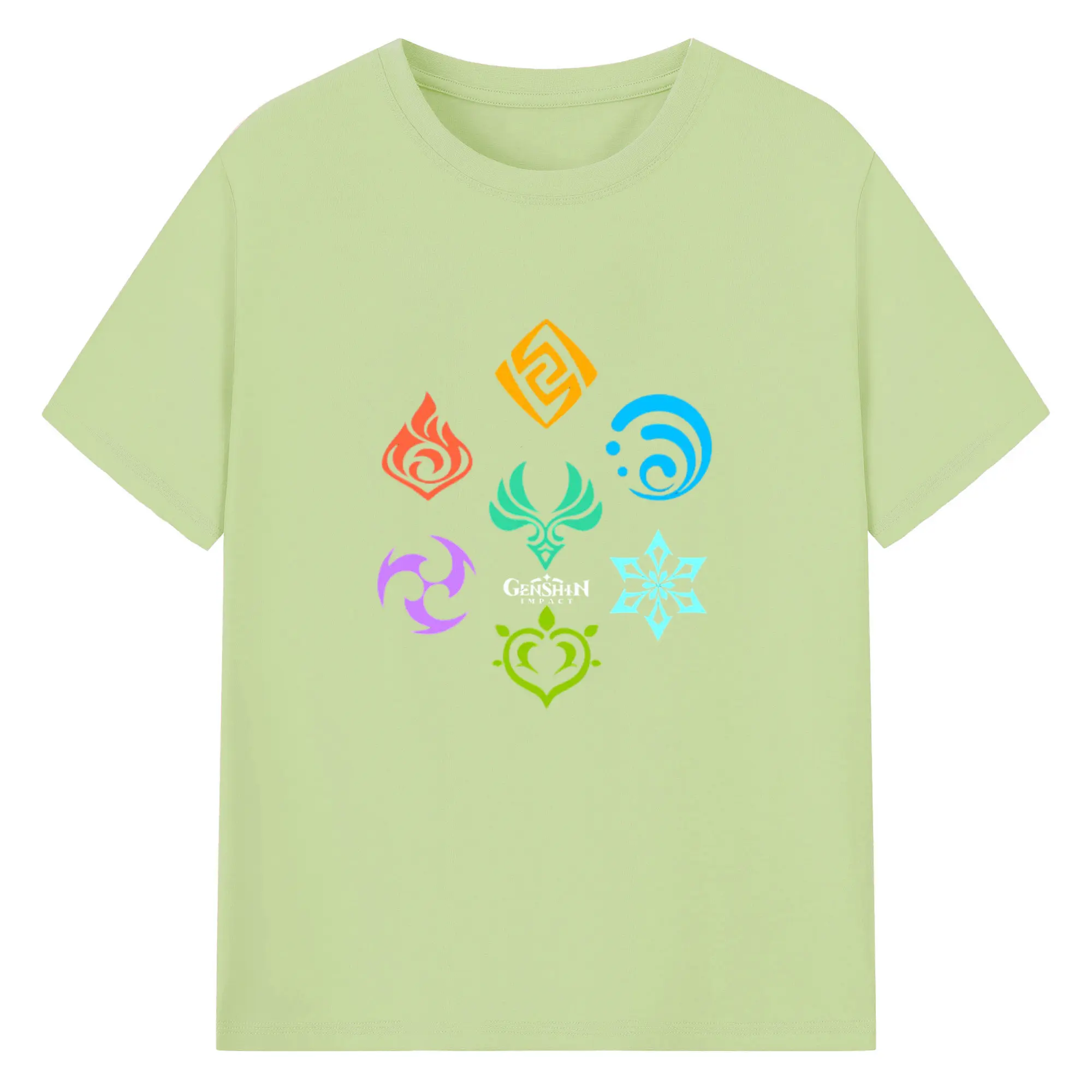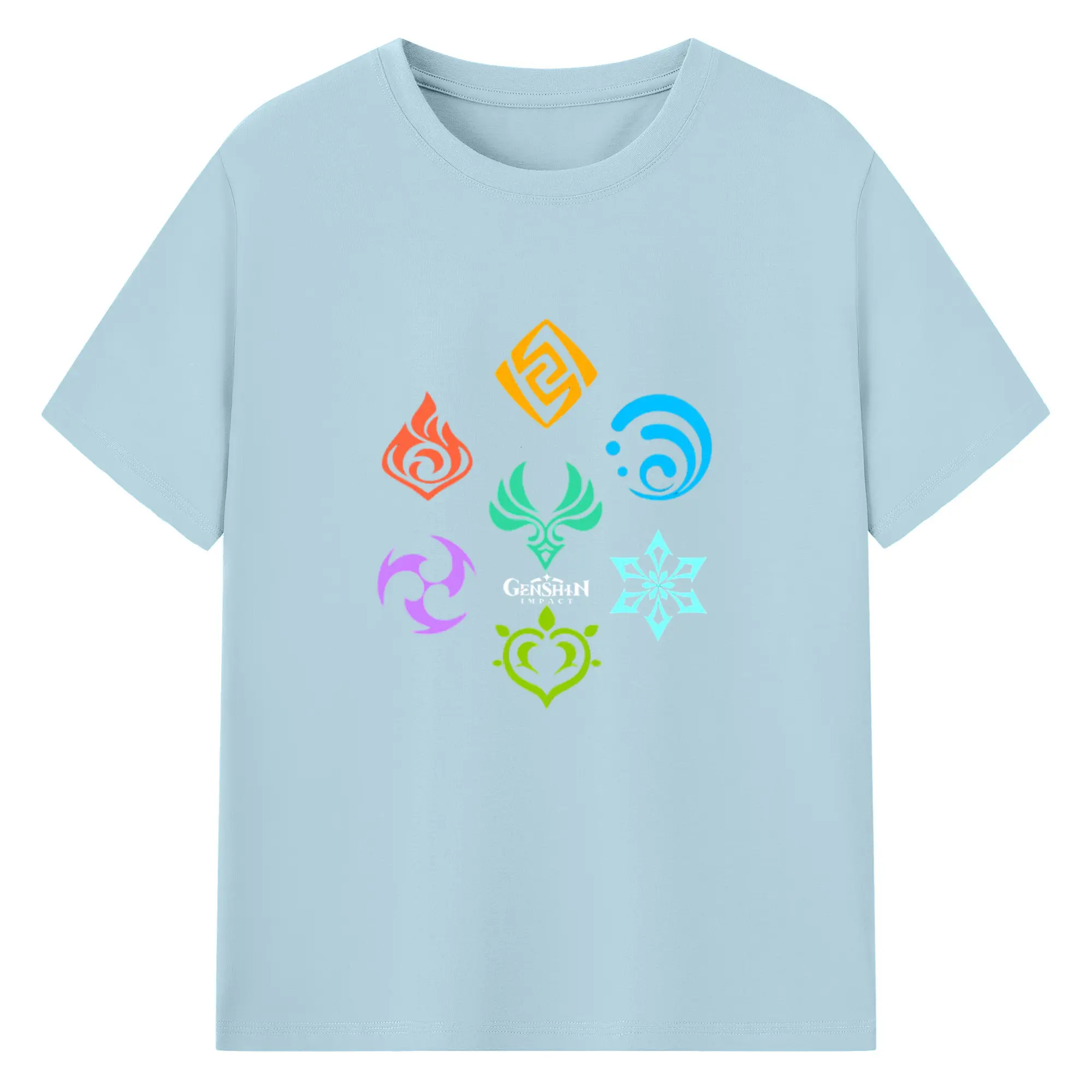 Genshin 原神の七元素ロゴ - 綿100% 半袖Tシャツ ・ フロントプリント ・ 快適 通気性 ・ 日常使い 散歩 スポーツ用
