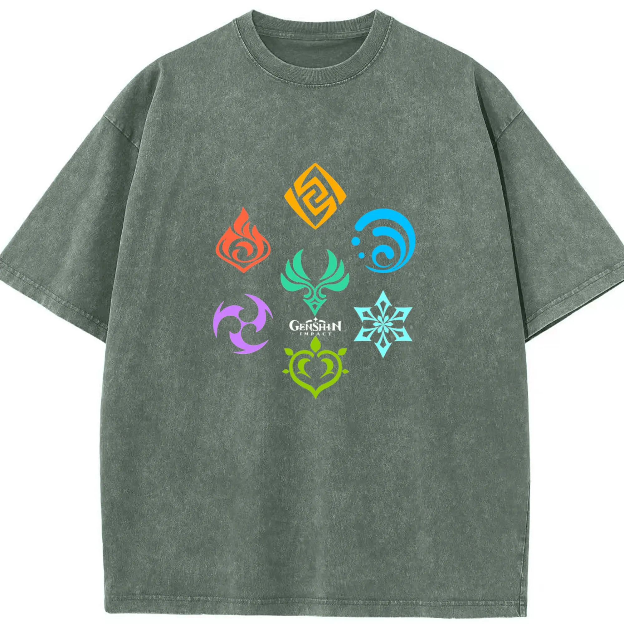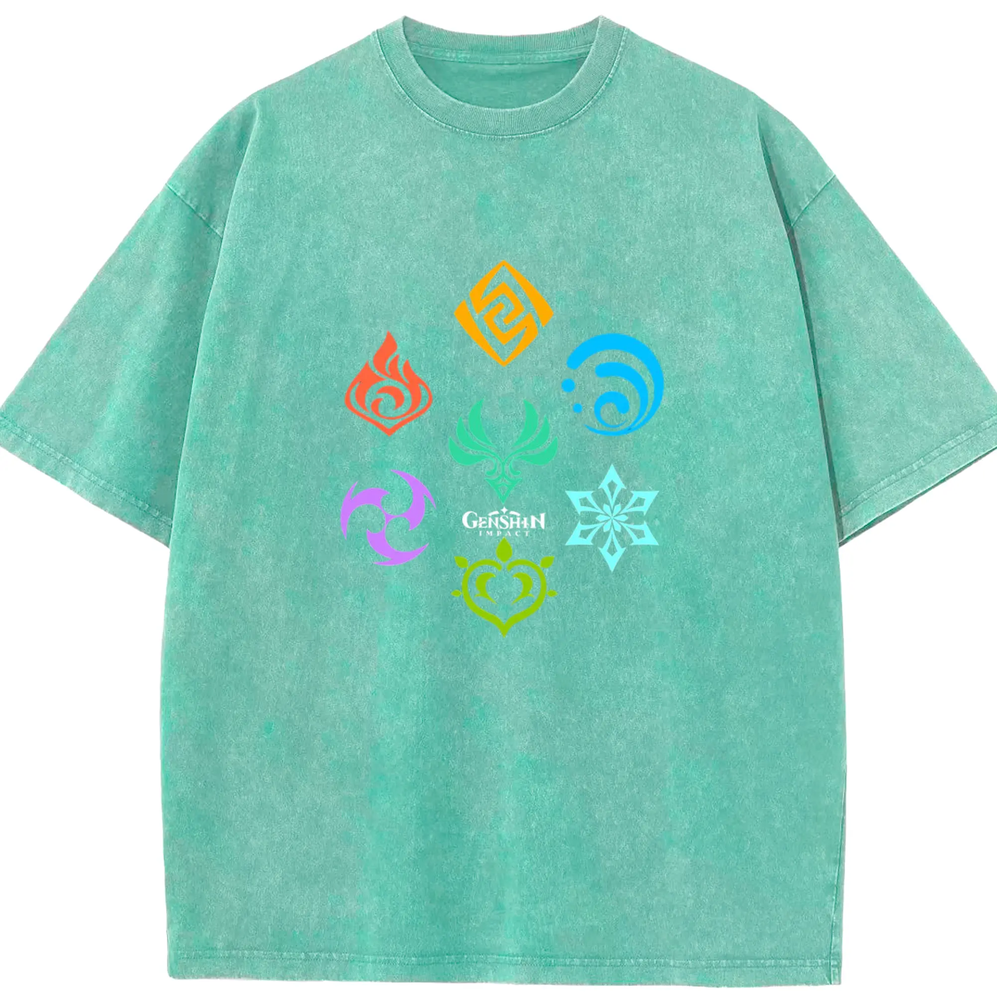 Genshin 原神の七元素ロゴ - 綿100% ヴィンテージ風 半袖Tシャツ ・ フロントプリント ・ 柔らか肌触り ・ 通気性 快適 ・ スポーツ カジュアル 外出用