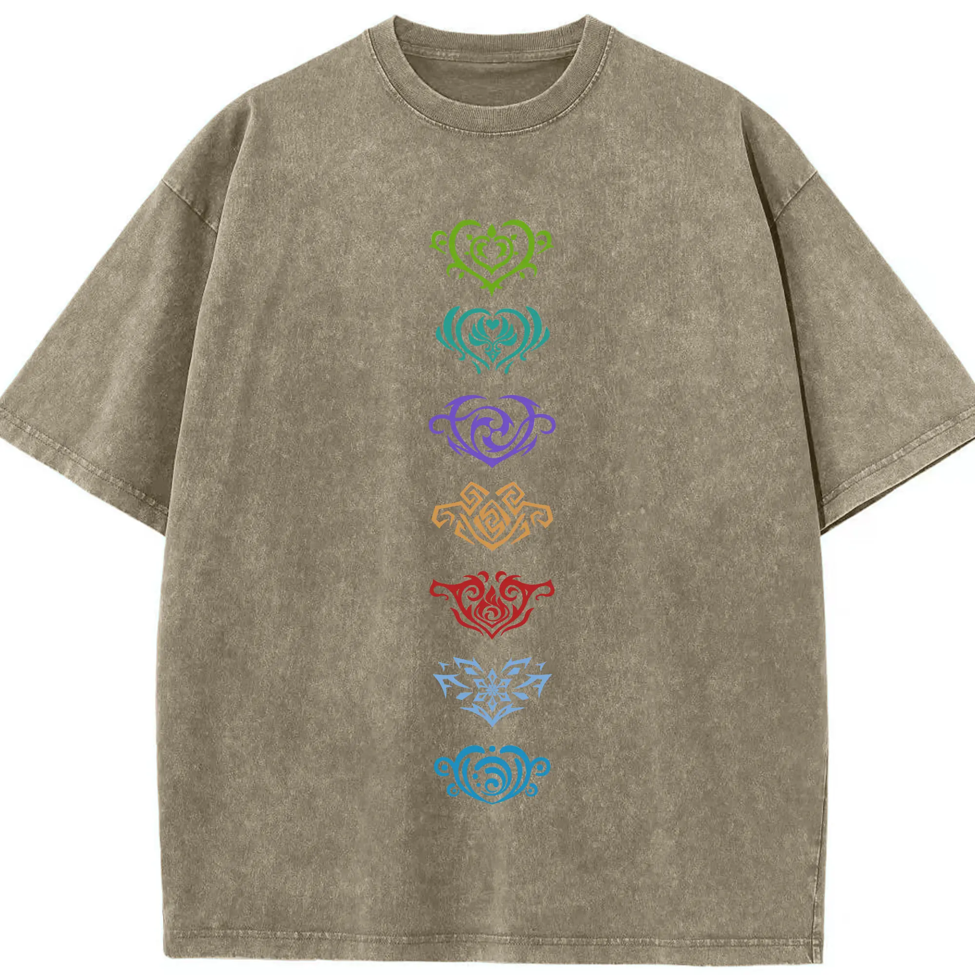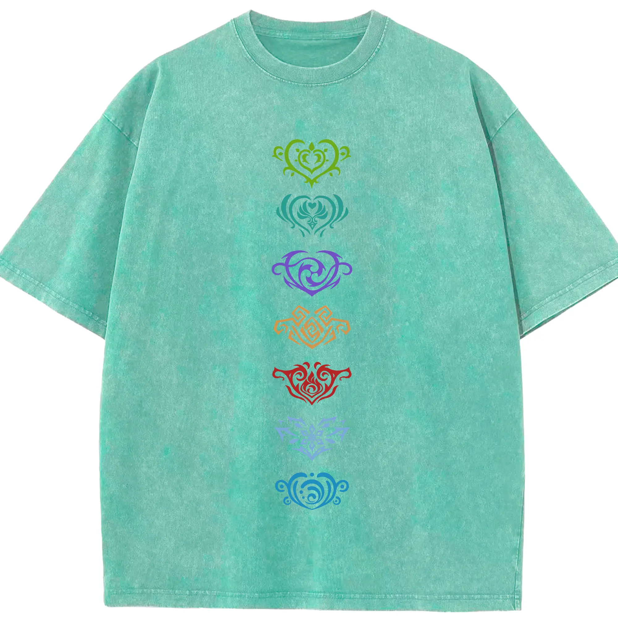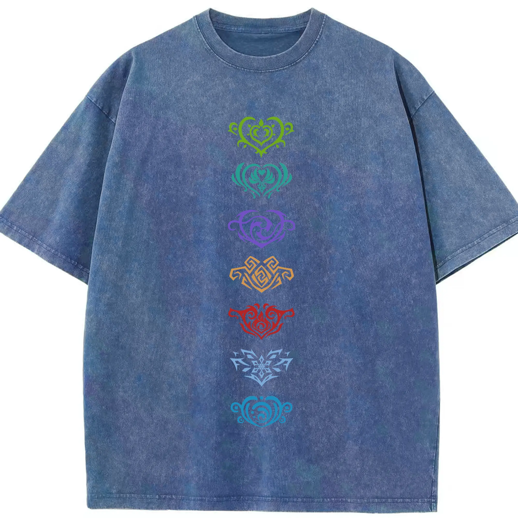 Genshin Genshin 原神の七元素ロゴ - 綿100% ヴィンテージ風 半袖Tシャツ ・ フロントプリント ・ 柔らか肌触り ・ 通気性 快適 ・ スポーツ カジュアル 外出用