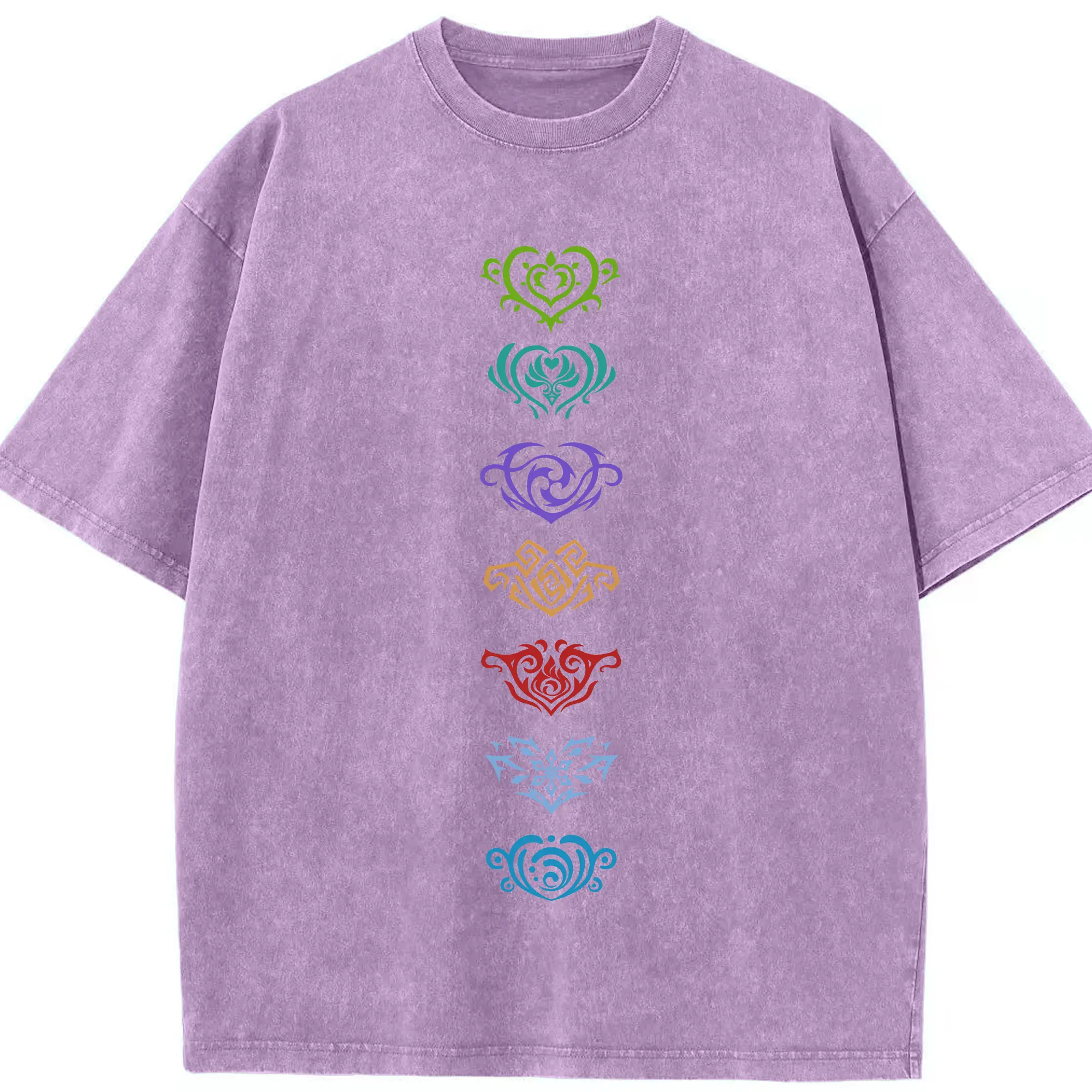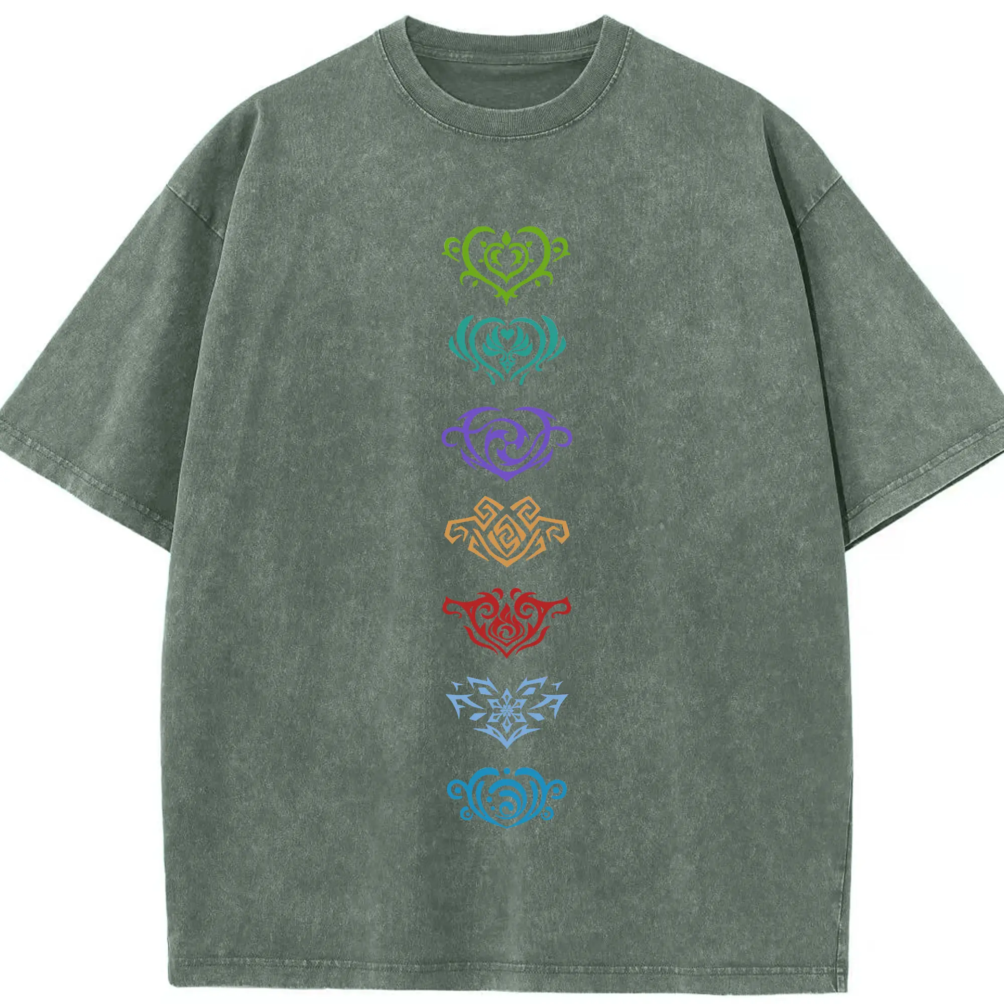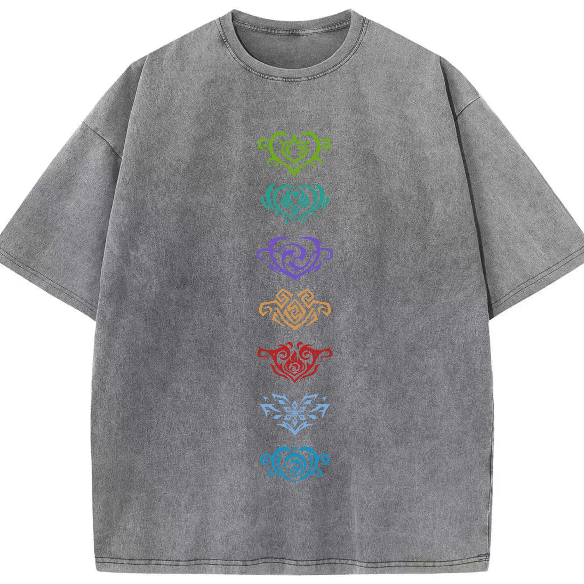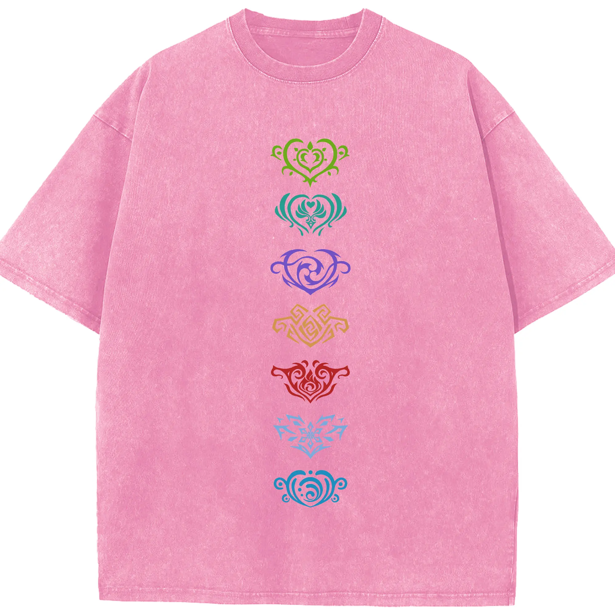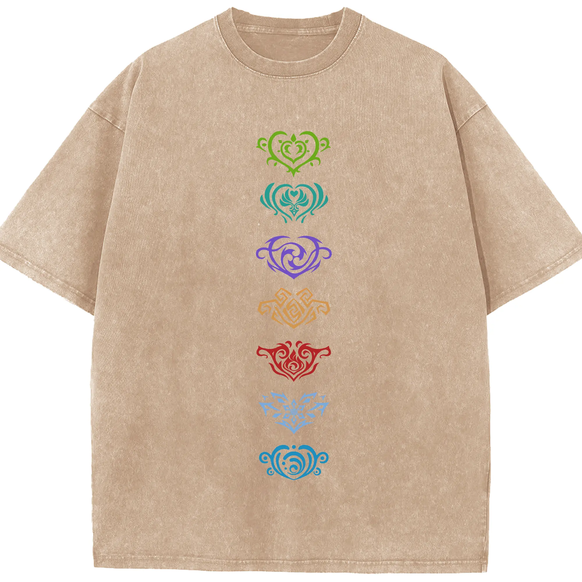 Genshin Genshin 原神の七元素ロゴ - 綿100% ヴィンテージ風 半袖Tシャツ ・ フロントプリント ・ 柔らか肌触り ・ 通気性 快適 ・ スポーツ カジュアル 外出用